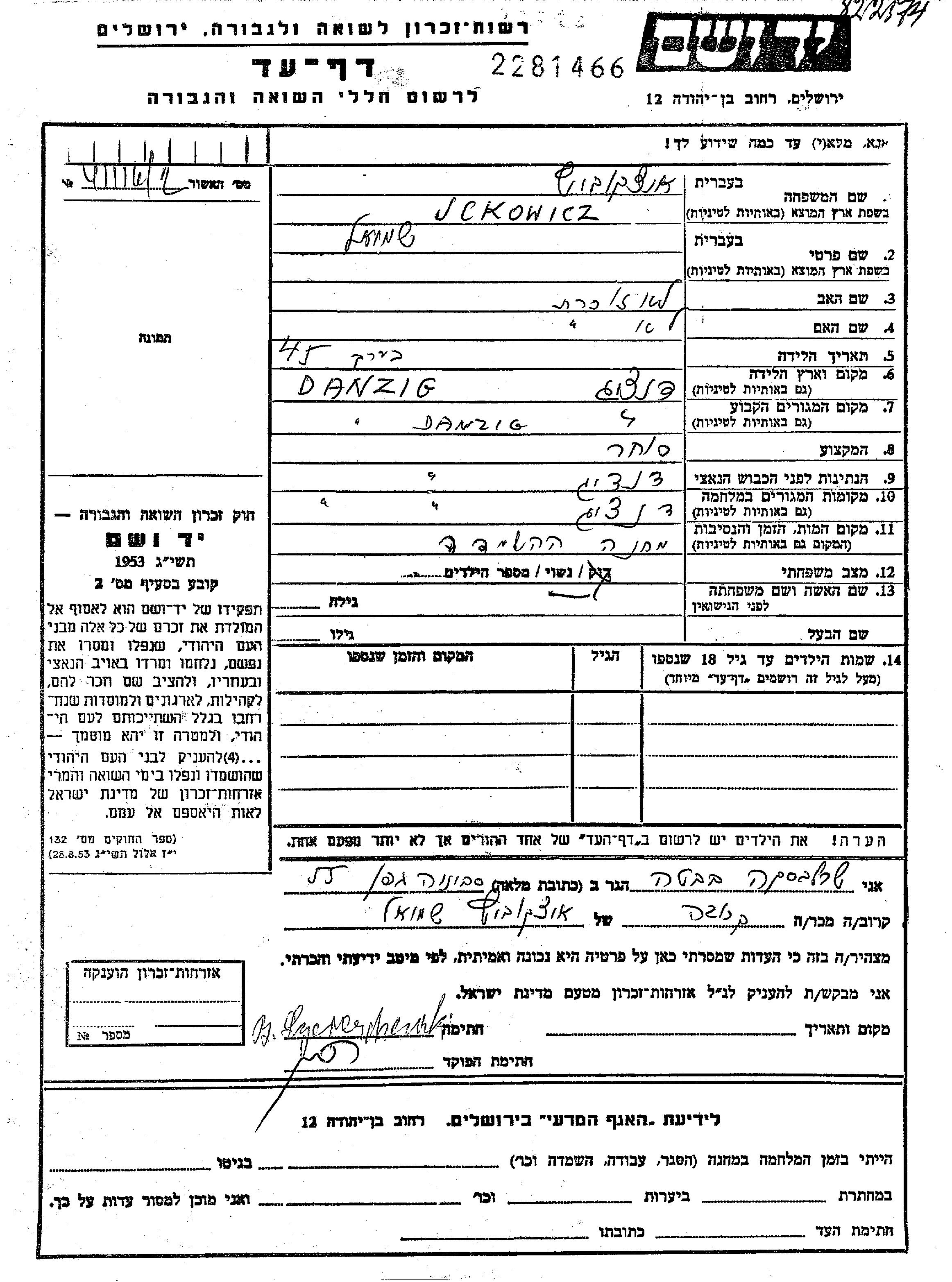 Ickowicz Shmuel Danzig, Ville Franche de Danzig Feuille de témoignage