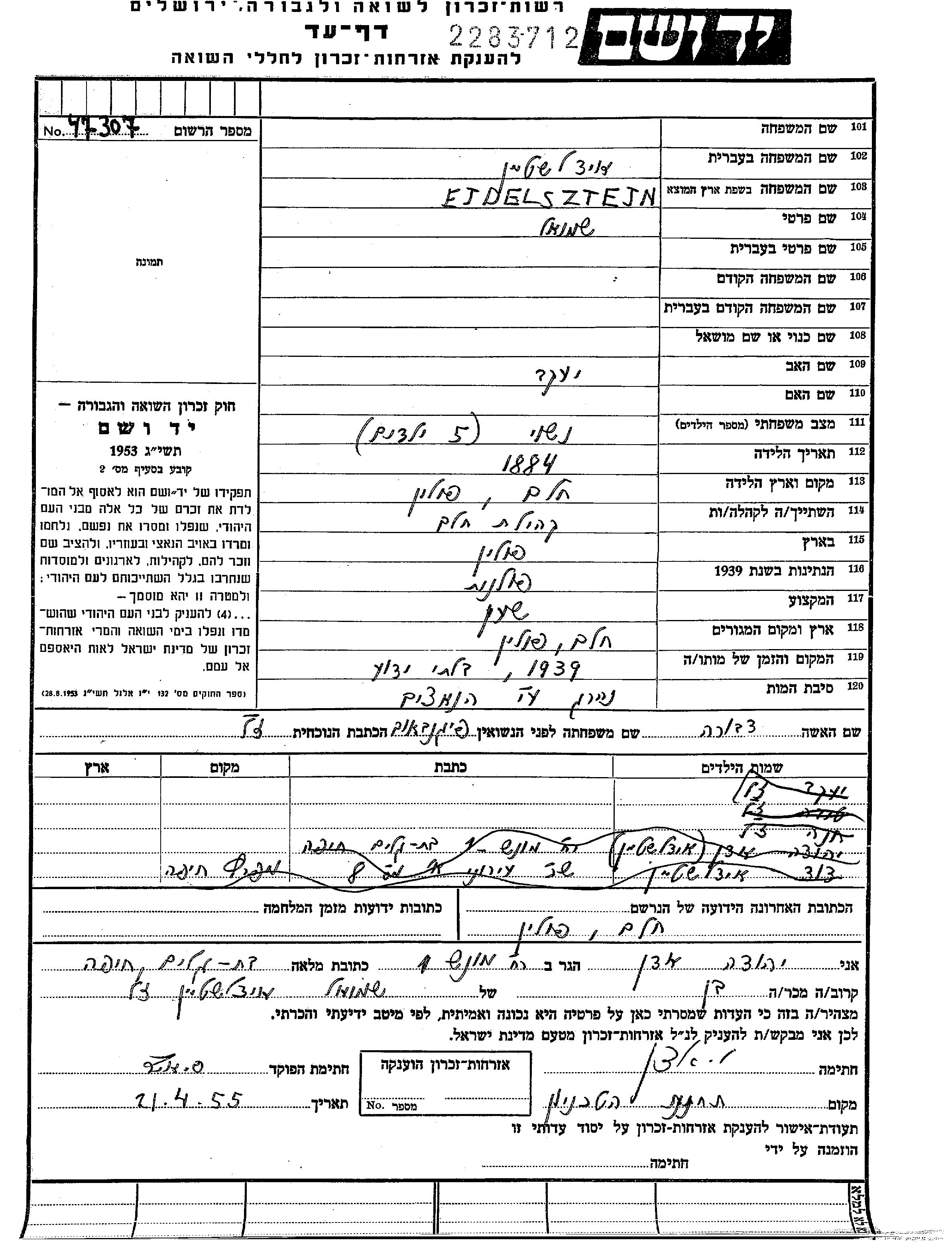 Eidelsztejn Shmuel 1884 Chelem, Pologne Feuille de témoignage