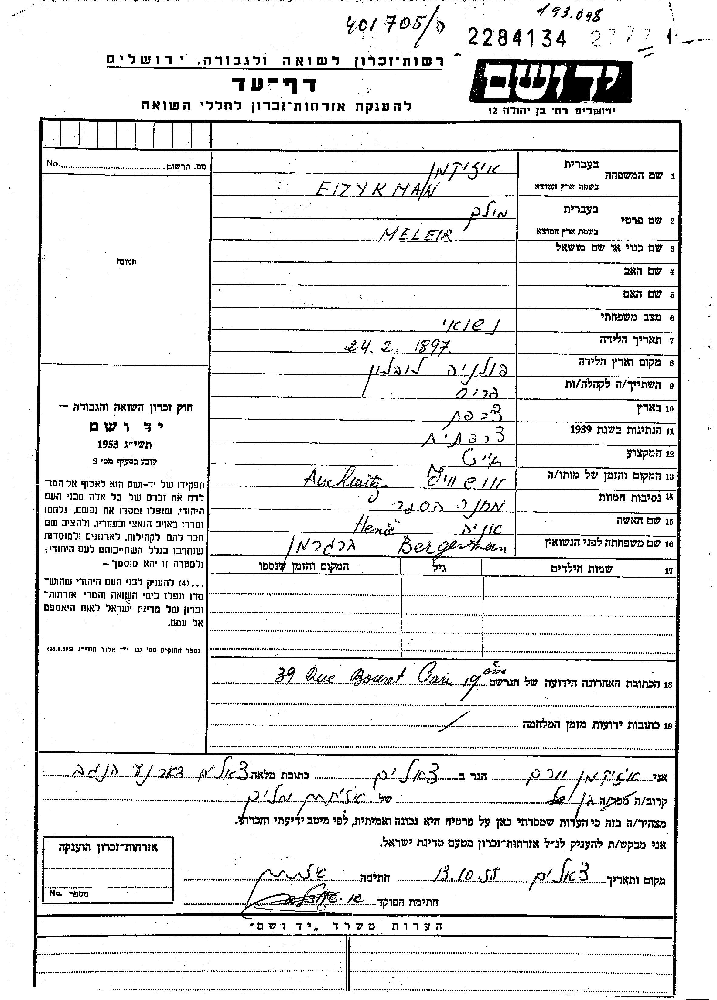 Yad Vashem - Pages of Testimony Names Memorial Collection