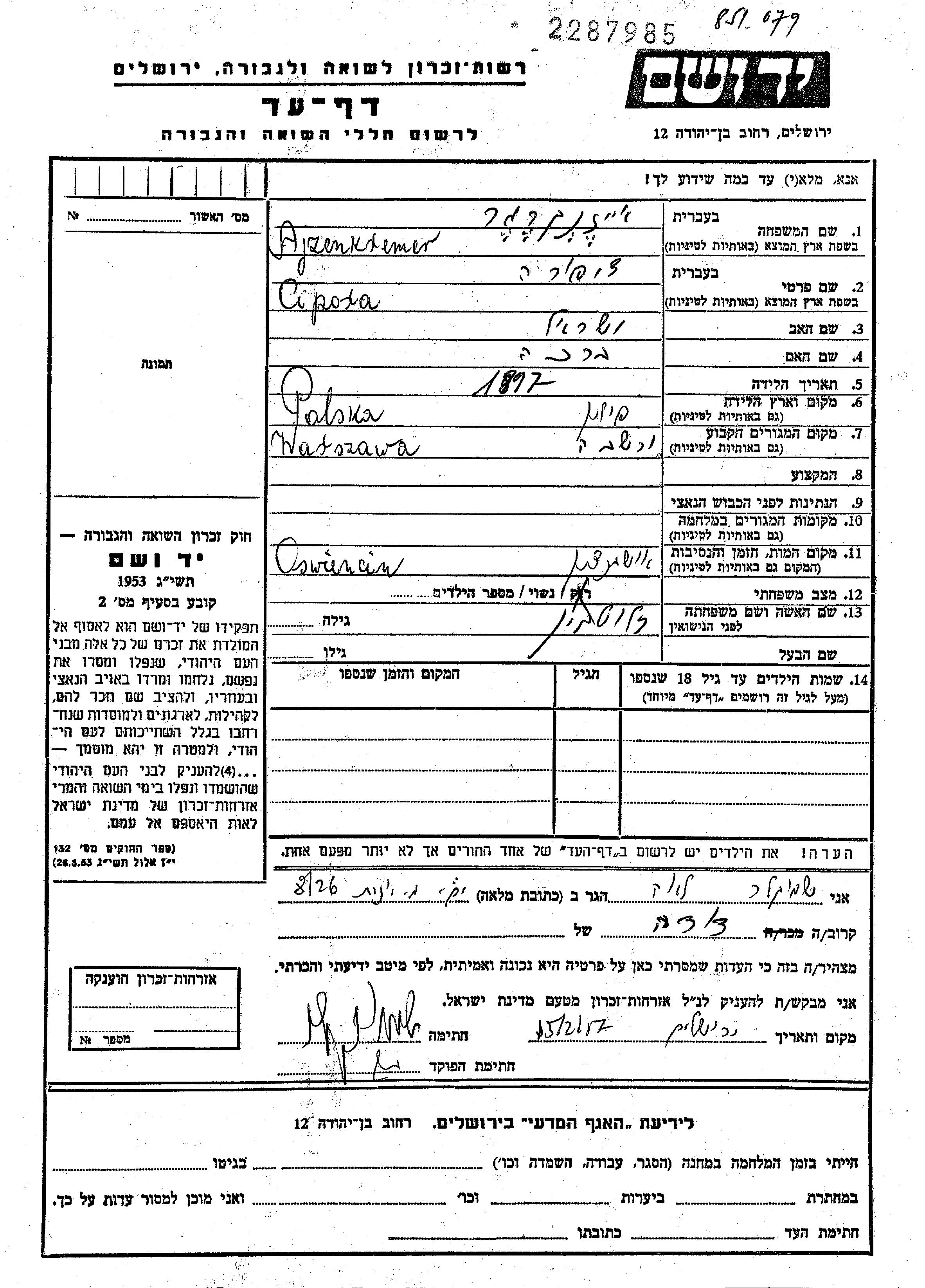 Ajzenkremer Cipora 1897 Warszawa, Pologne Feuille de témoignage