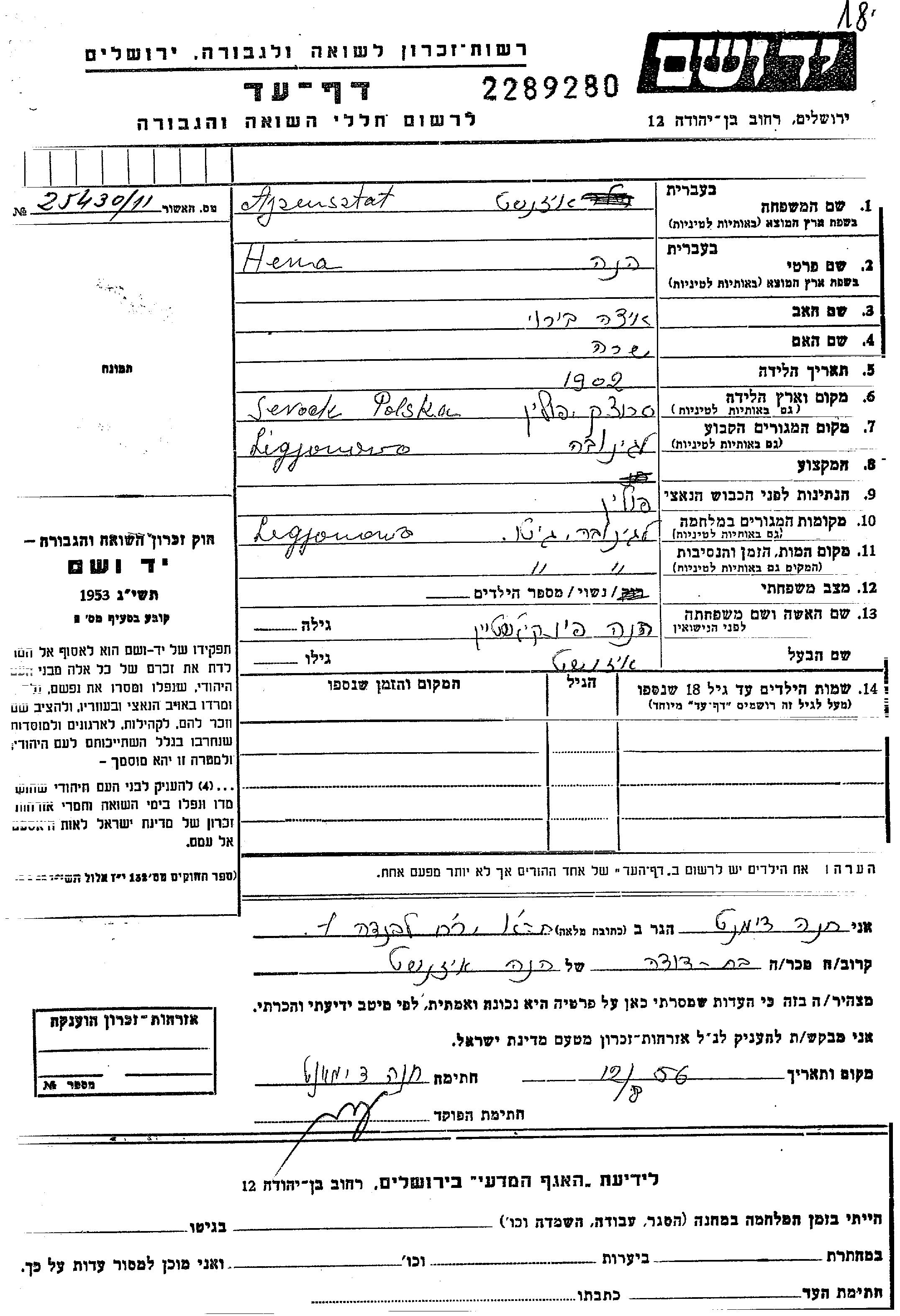 Ajzensztat Hena 1902 Legionowo, Pologne Feuille de témoignage