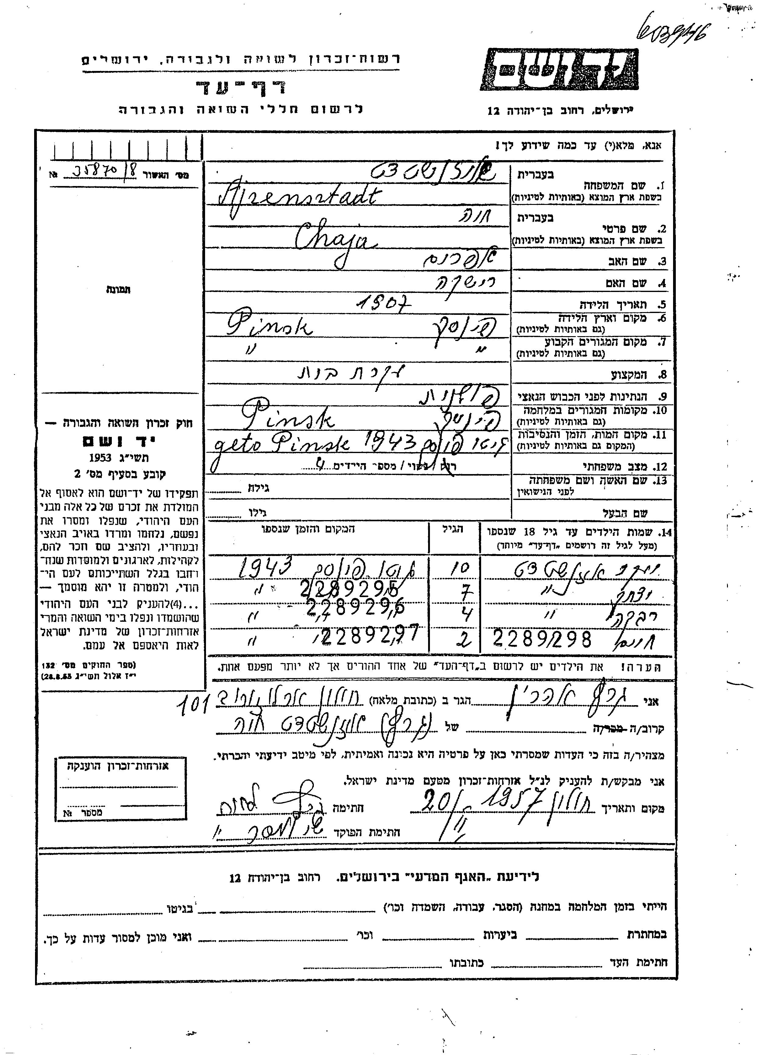 Ajzensztadt Yaakov 1933 Pinsk, Pologne Feuille de témoignage