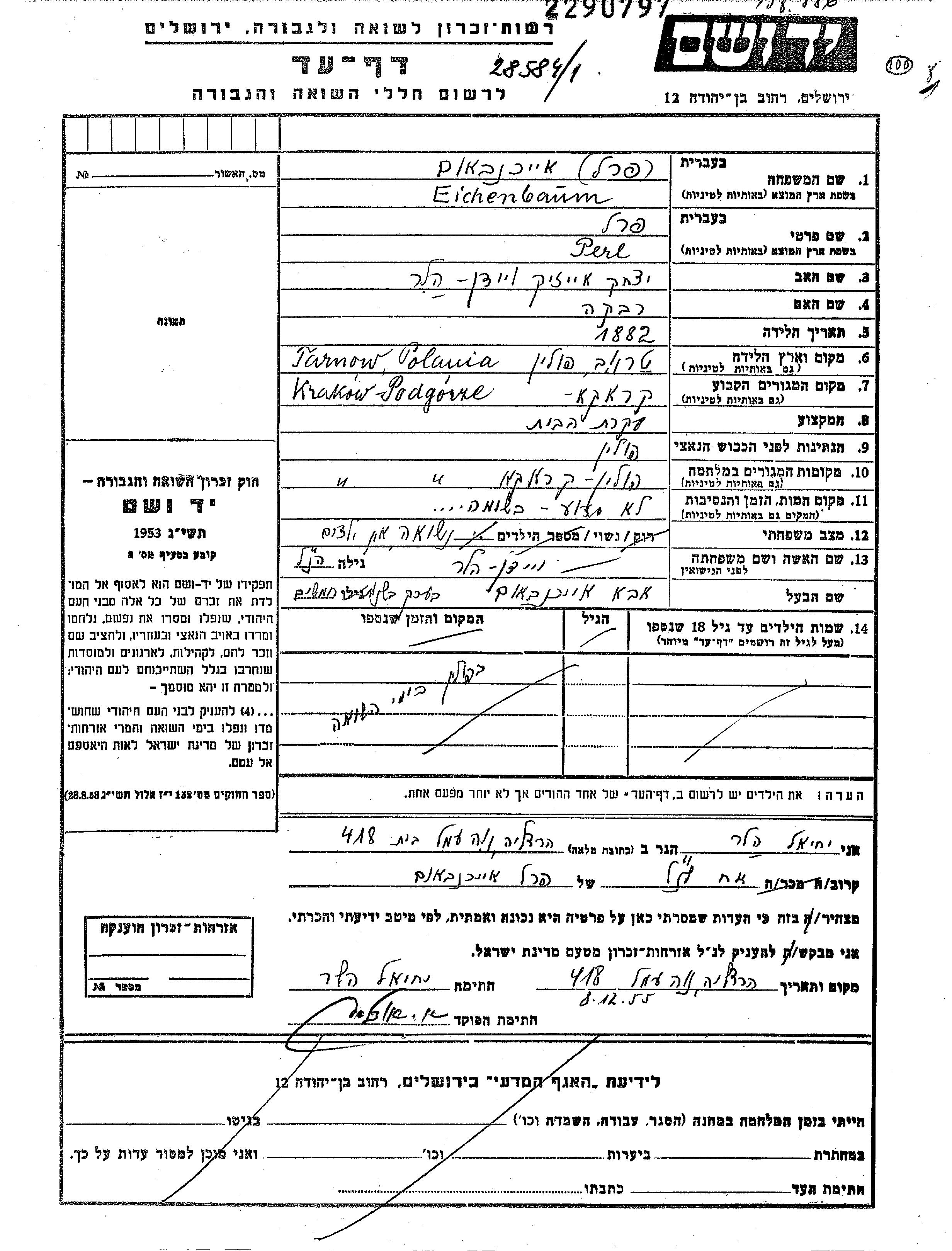 Perl Eichenbaum née Veiden est née à Tarnow, Pologne en 1882, fille de Ytzkhak et de Rivka. Elle était Femme au foyer et Mariée à Aba. Avant la seconde guerre mondiale elle vivait à Krakow, Pologne. Pendant la guerre, elle était à Krakow, Pologne.