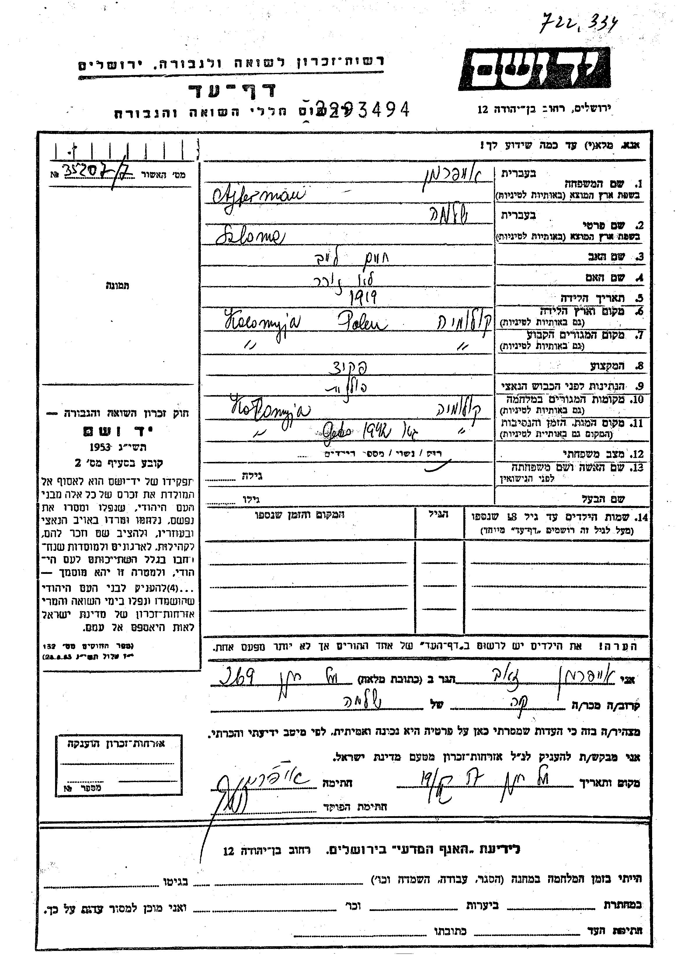 Ajferman Szloma 1919 Kolomyja, Pologne Feuille de témoignage