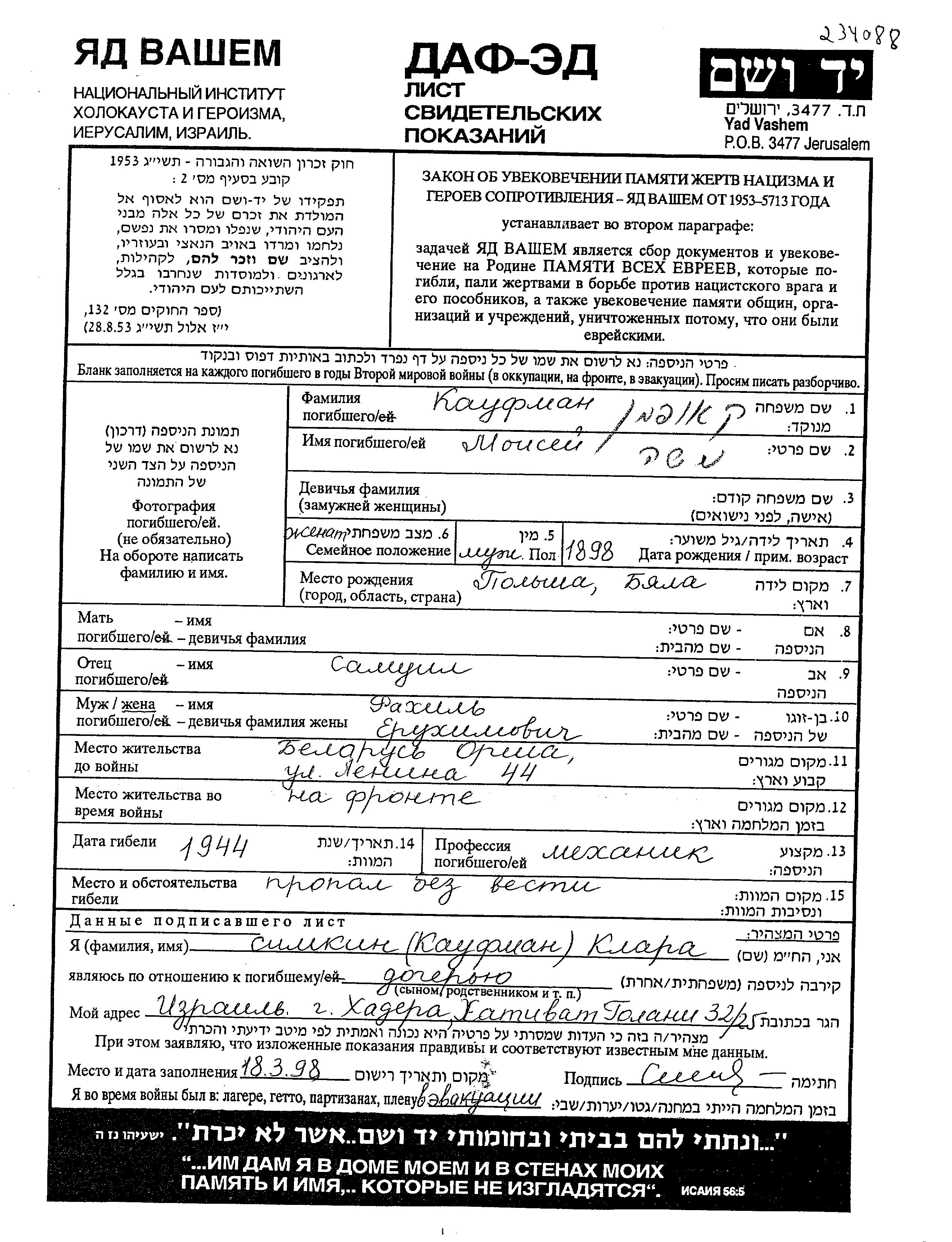 Kaufman Moisei 1898 Orsha, Bélorussie (URSS) Feuille de témoignage