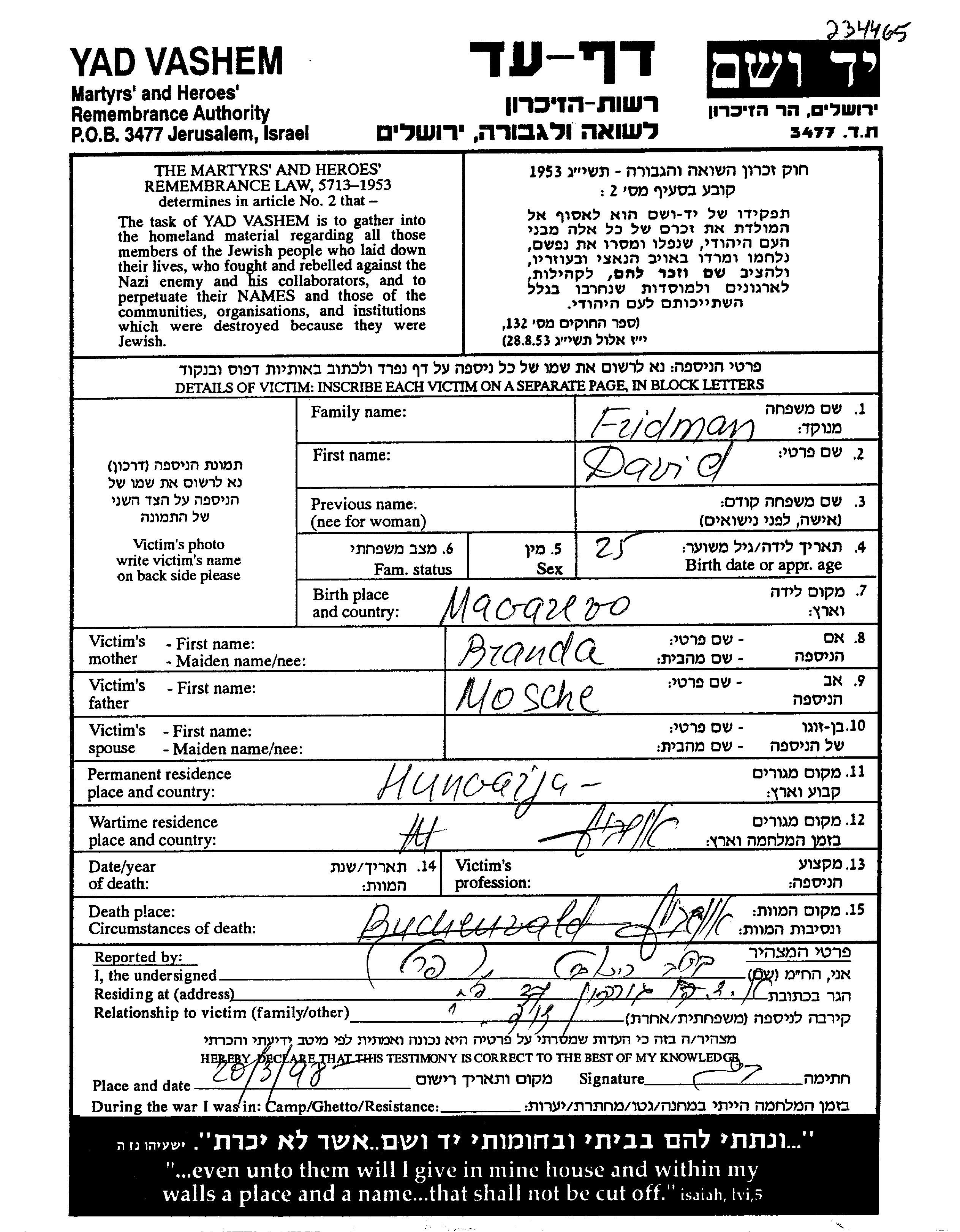 David a été assassiné pendant la Shoah. Lieu de la mort: Auschwitz, Pologne.