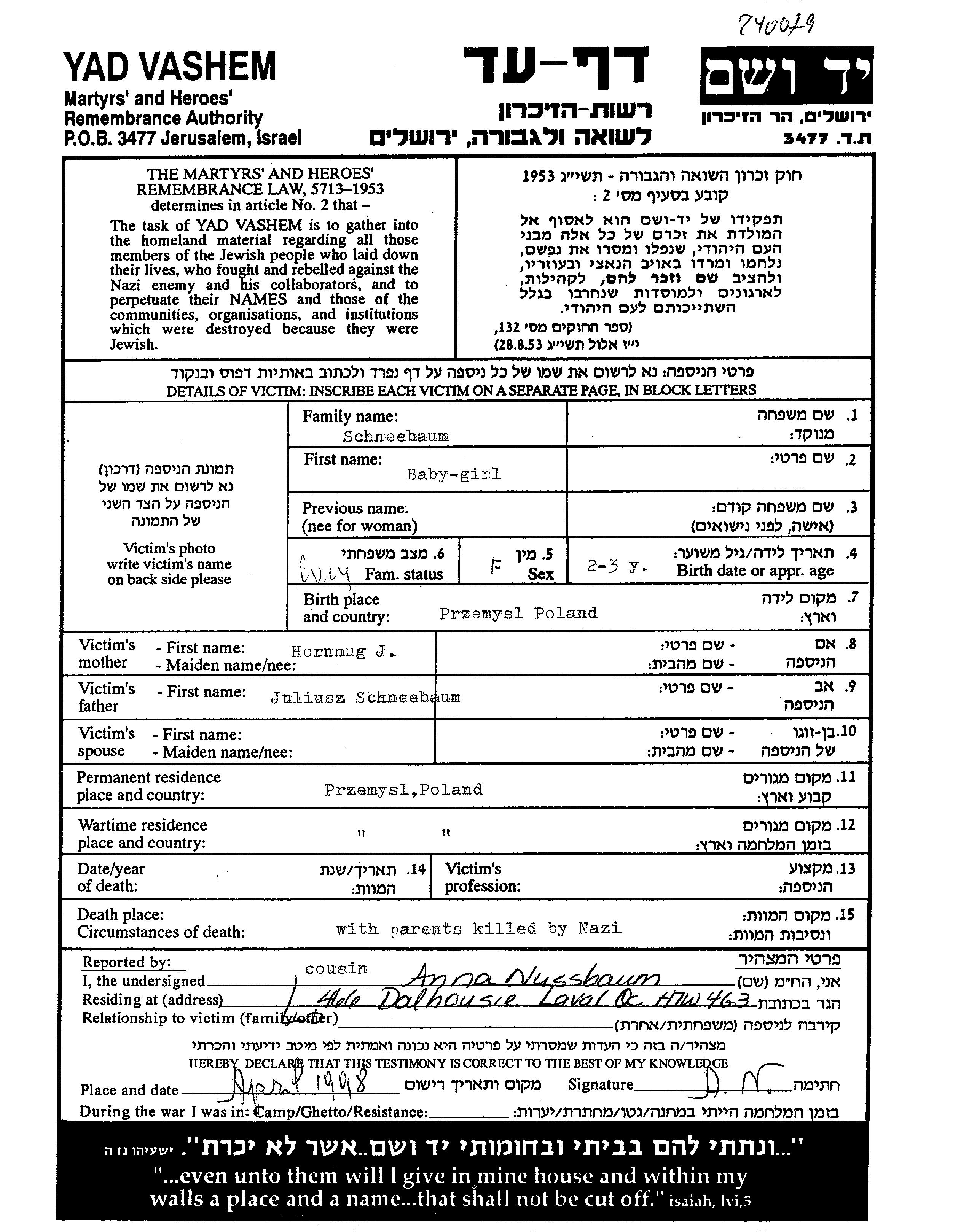 Schneebaum prénom inconnu Przemysl, Pologne Feuille de témoignage