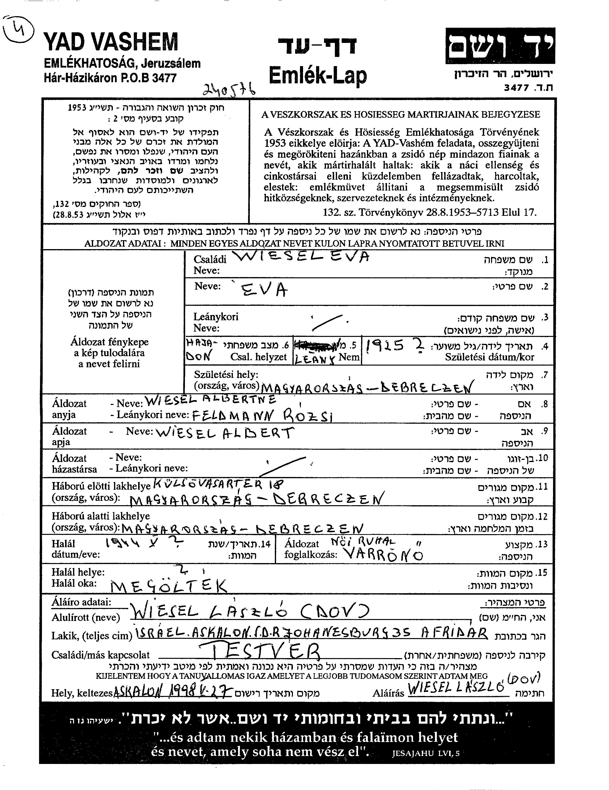 Wiesel Eva 1925 Debrecen, Hongrie Feuille de témoignage