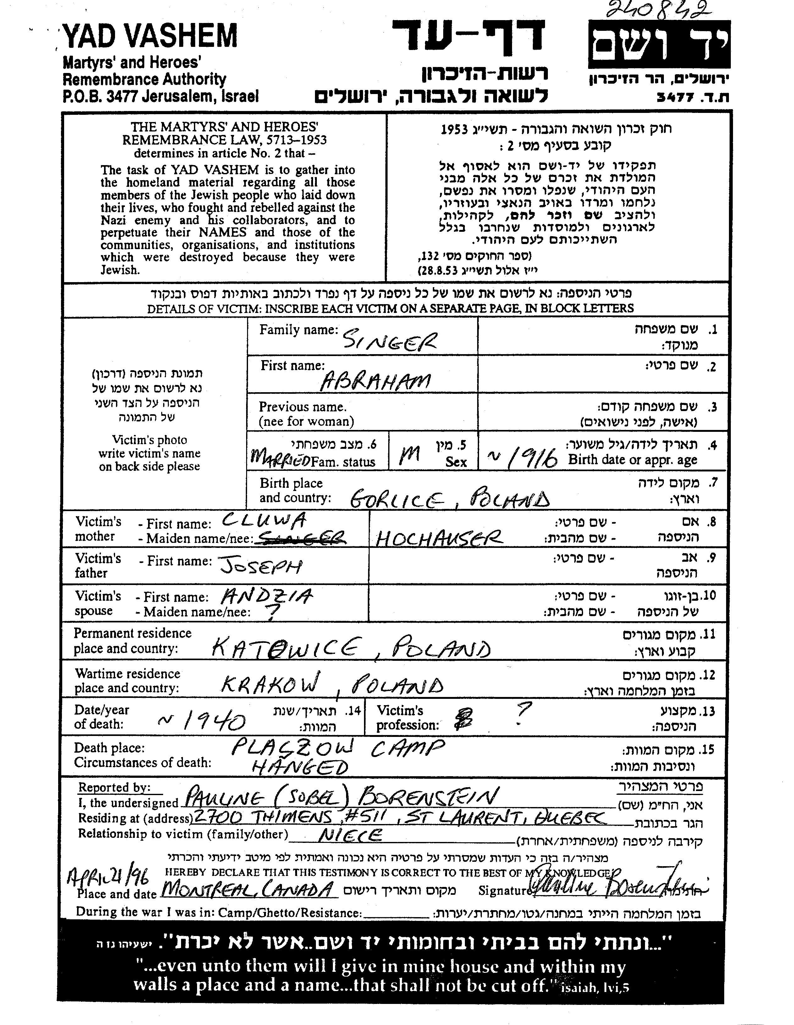Abraham Singer est né à Gorlice, Pologne en 1916, fils de Joseph et de Cluwa née Hochhauser. Il était Mariée à Andzia. Avant la seconde guerre mondiale il vivait à Katowice, Pologne. Au cours de la guerre, il était à Krakow, Pologne.