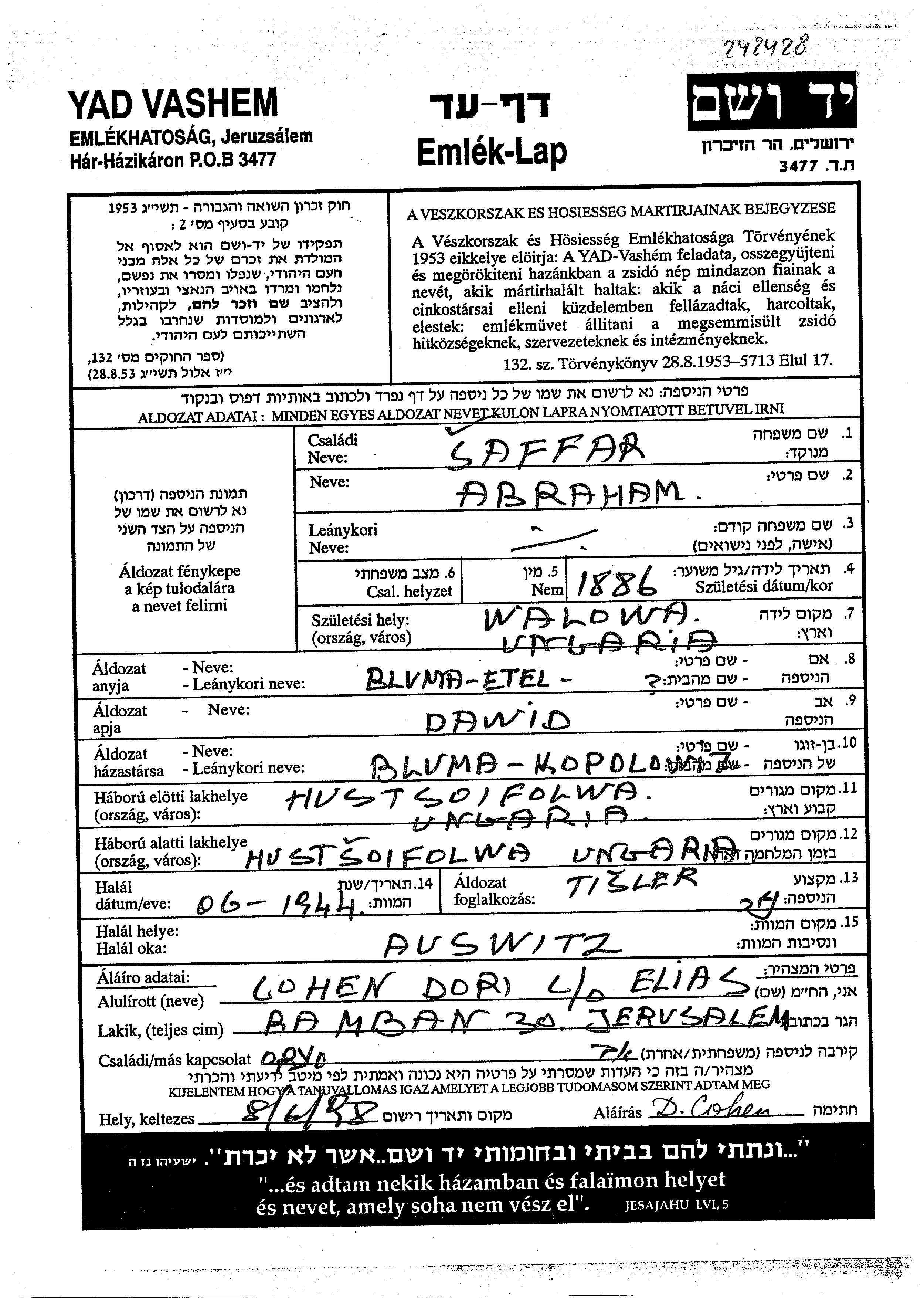 Saffar Shefer Abraham 1886 Hust, Tchécoslovaquie Feuille de témoignage
