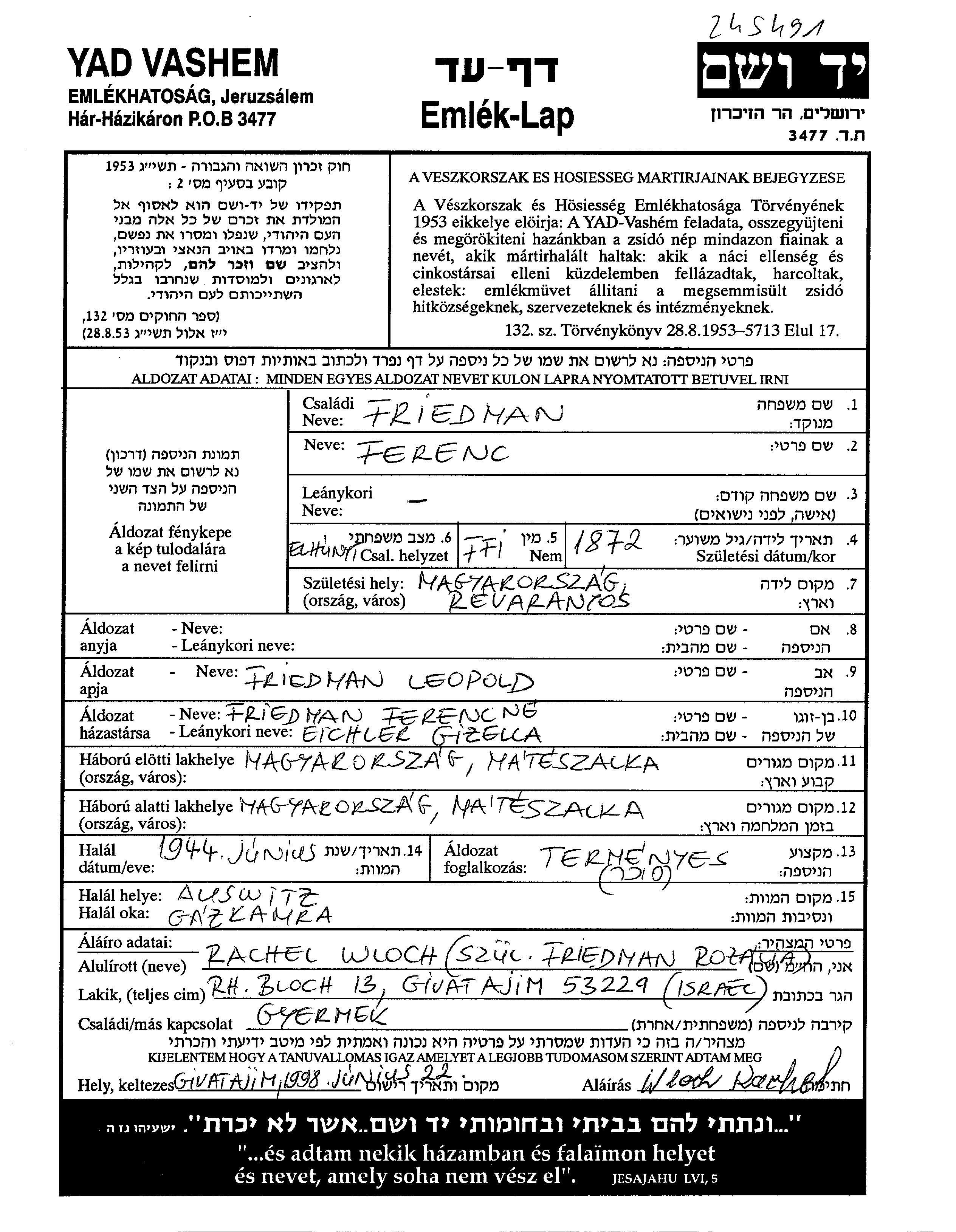 Ferentz Friedman est né à Revaranyos, Hongrie en 1872, fils de Leopold. Il était Commerçant/e et Mariée à Gizella. Avant la seconde guerre mondiale il vivait à Mateszalka, Hongrie. Au cours de la guerre, il était à Mateszalka, Hongrie.