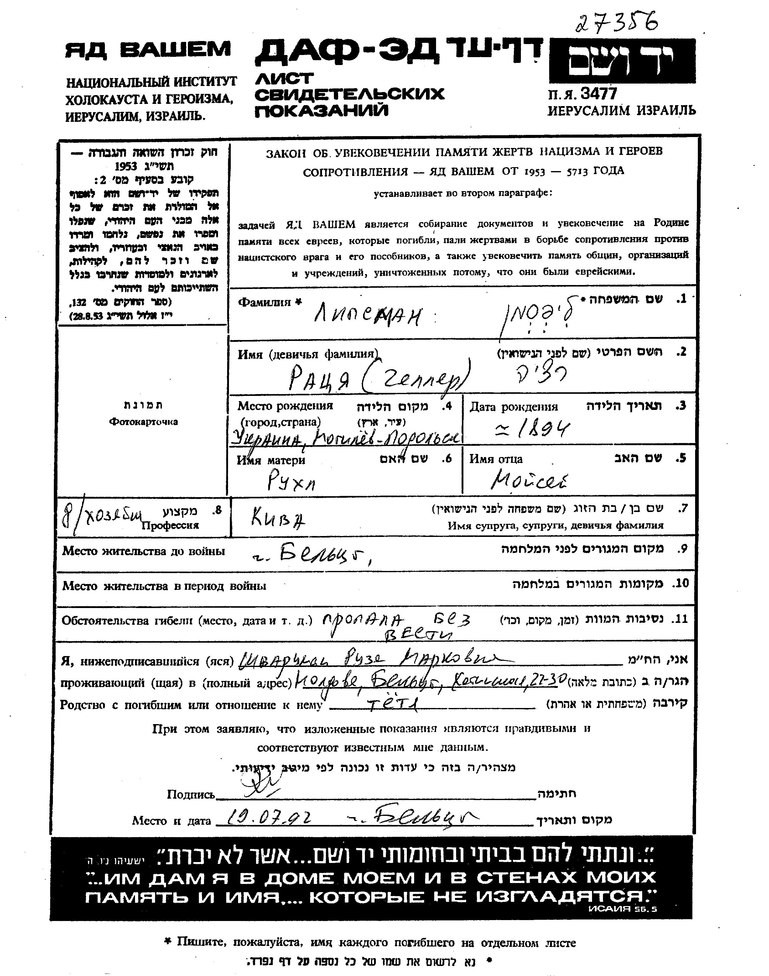 Lipsman Ratzia 1894 Bălți, Roumanie Feuille de témoignage