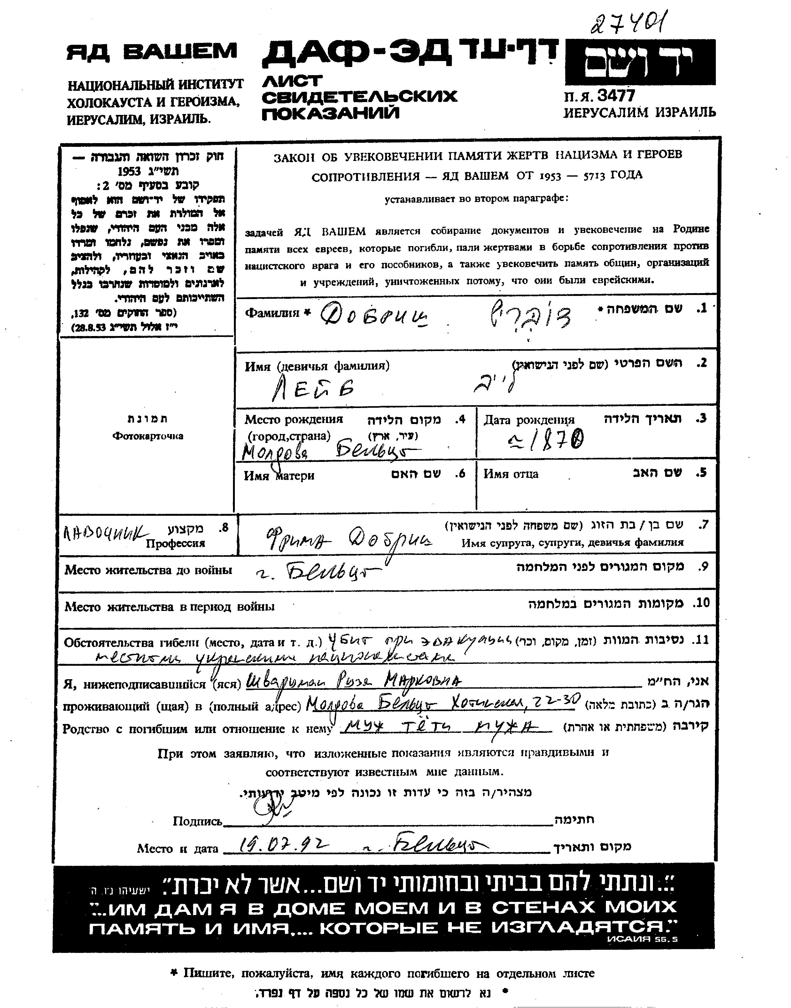 Dobrish Leib 1870 Bălți, Roumanie Feuille de témoignage