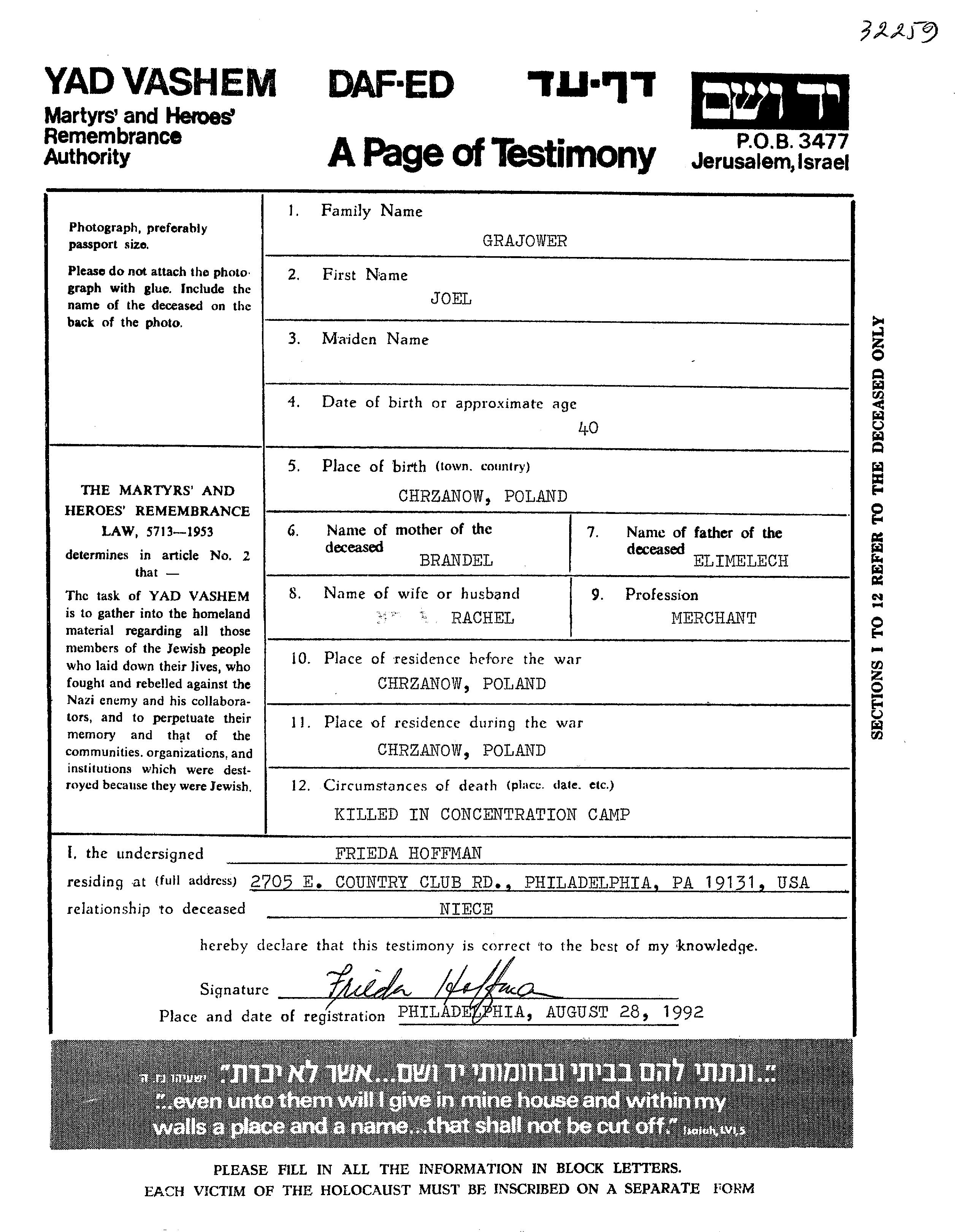Grajower Joel Chrzanow, Pologne Feuille de témoignage