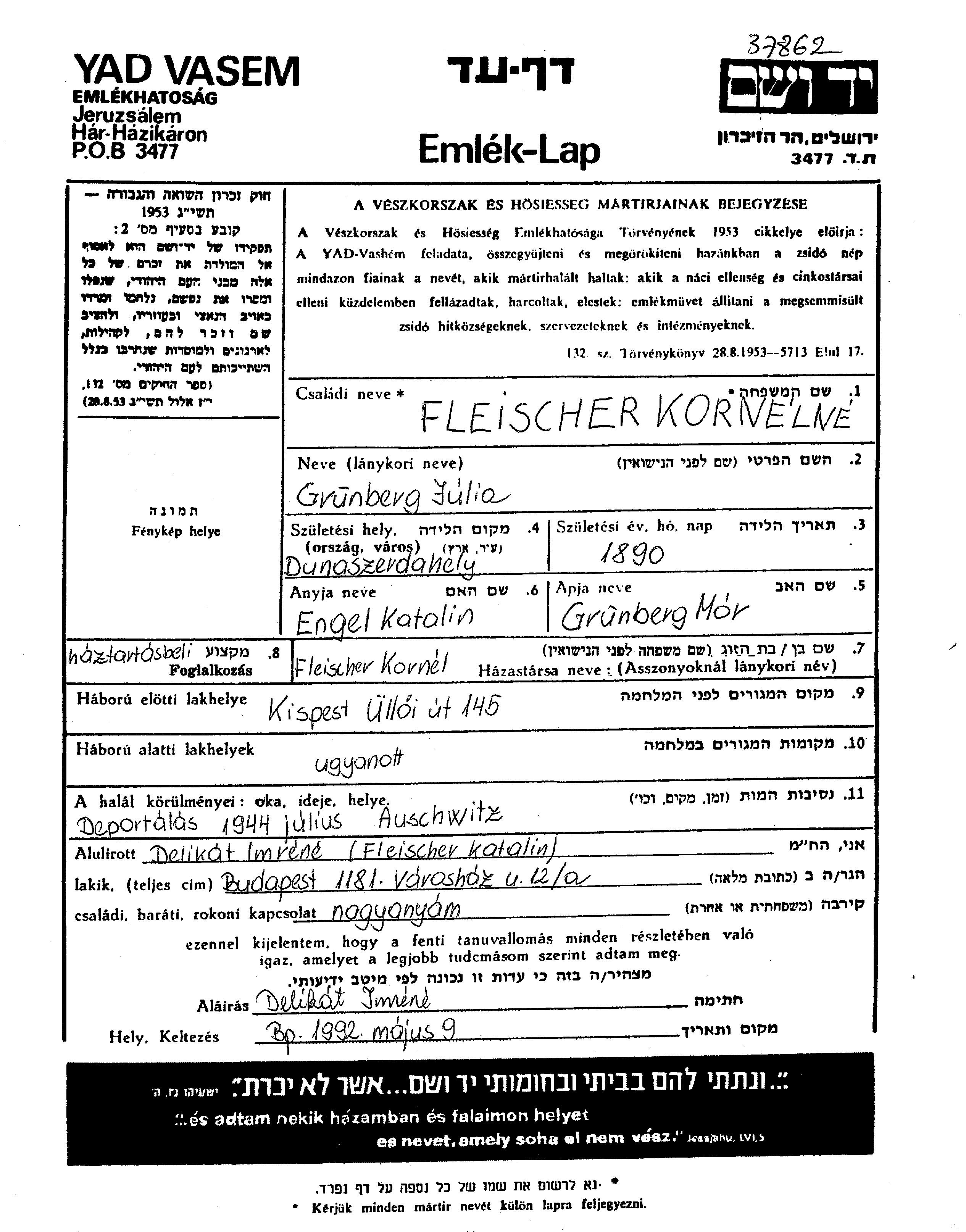 Julia Fleischer née Gruenberg est née à Dunaszerdahely, Tchécoslovaquie en 1890, fille de Mor et de Katalin née Angel. Elle était Femme au foyer et Mariée à Kornel Vilmosh. Avant la seconde guerre mondiale elle vivait à Kispest, Hongrie. Pendant la guerre, elle était à Kispest, Hongrie.