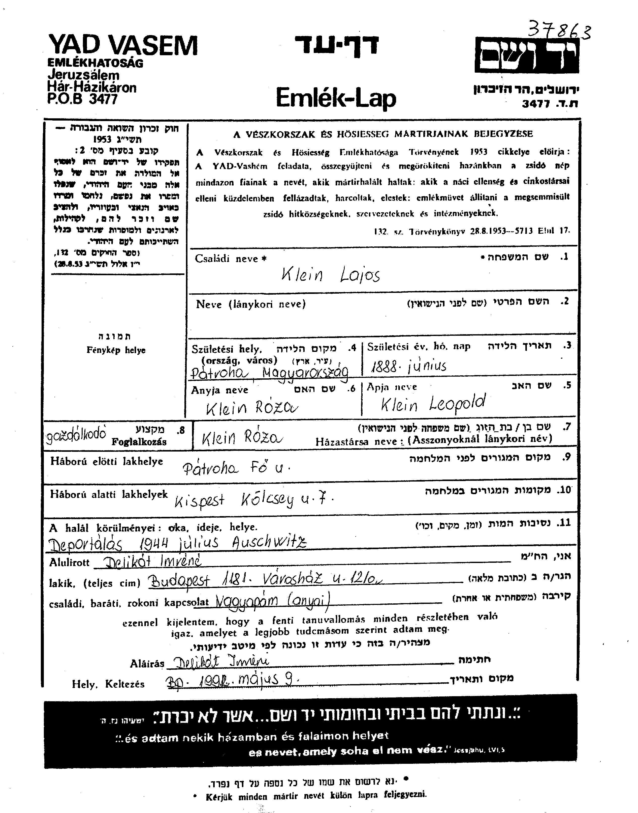 Lajos Klein est né à Patroha, Hongrie en 1888, fils de Leopold et de Roza. Il était Propriétaire foncier et Mariée à Roza. Avant la seconde guerre mondiale il vivait à Patroha, Hongrie. Au cours de la guerre, il était à Kispest, Hongrie.