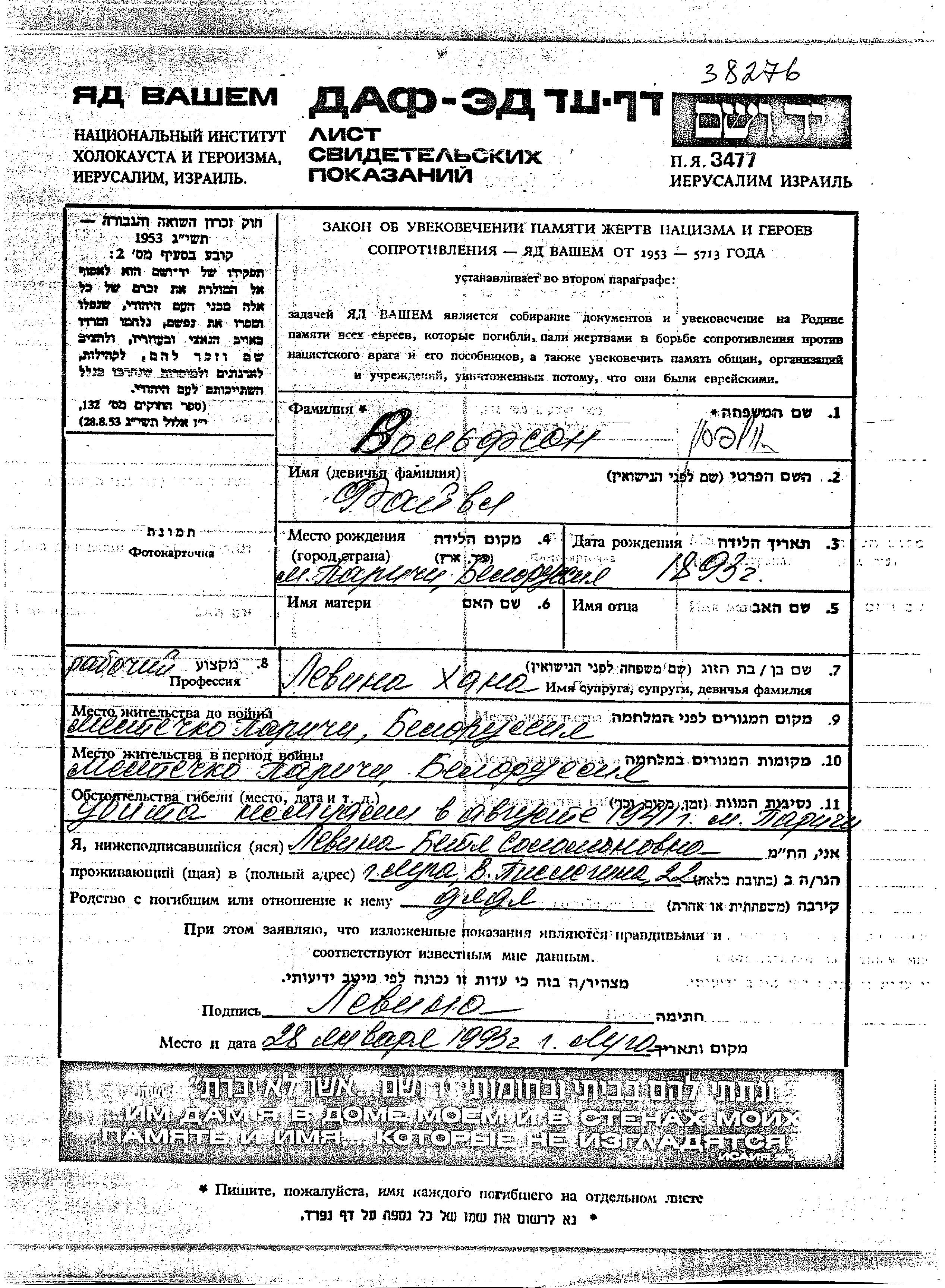 Volfson Faivl 1893 Parichi, Bélorussie (URSS) Feuille de témoignage