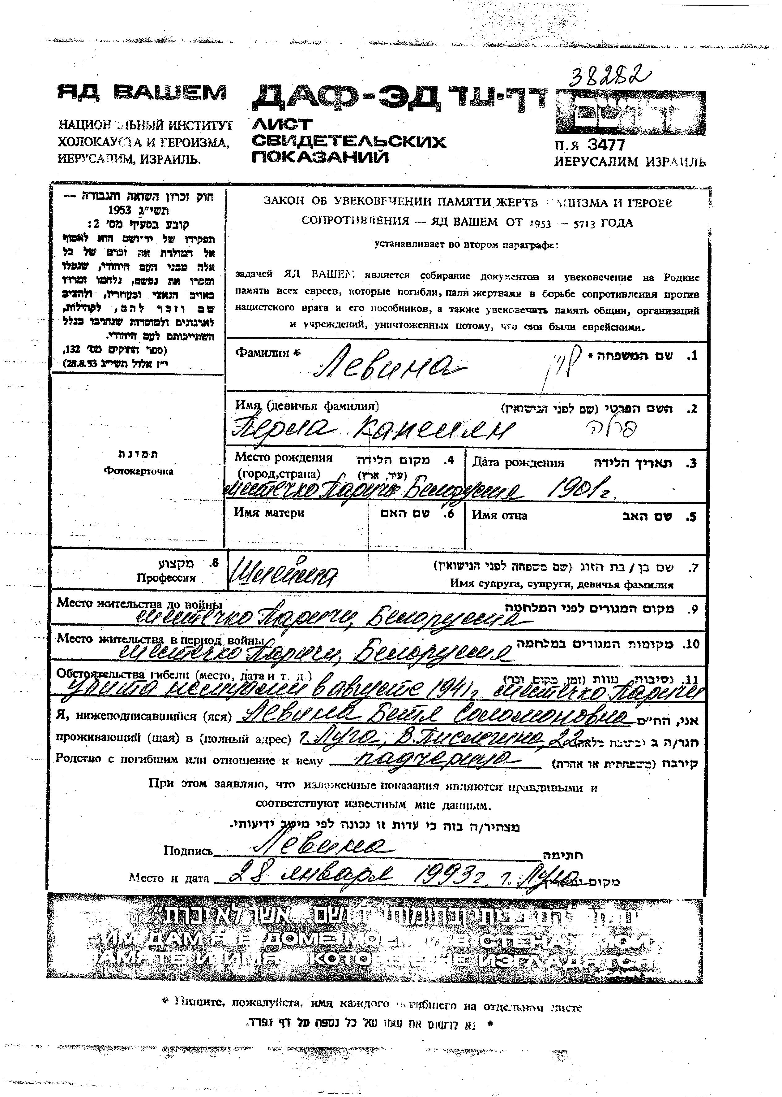 Levin Perla 1901 Parichi, Bélorussie (URSS) Feuille de témoignage
