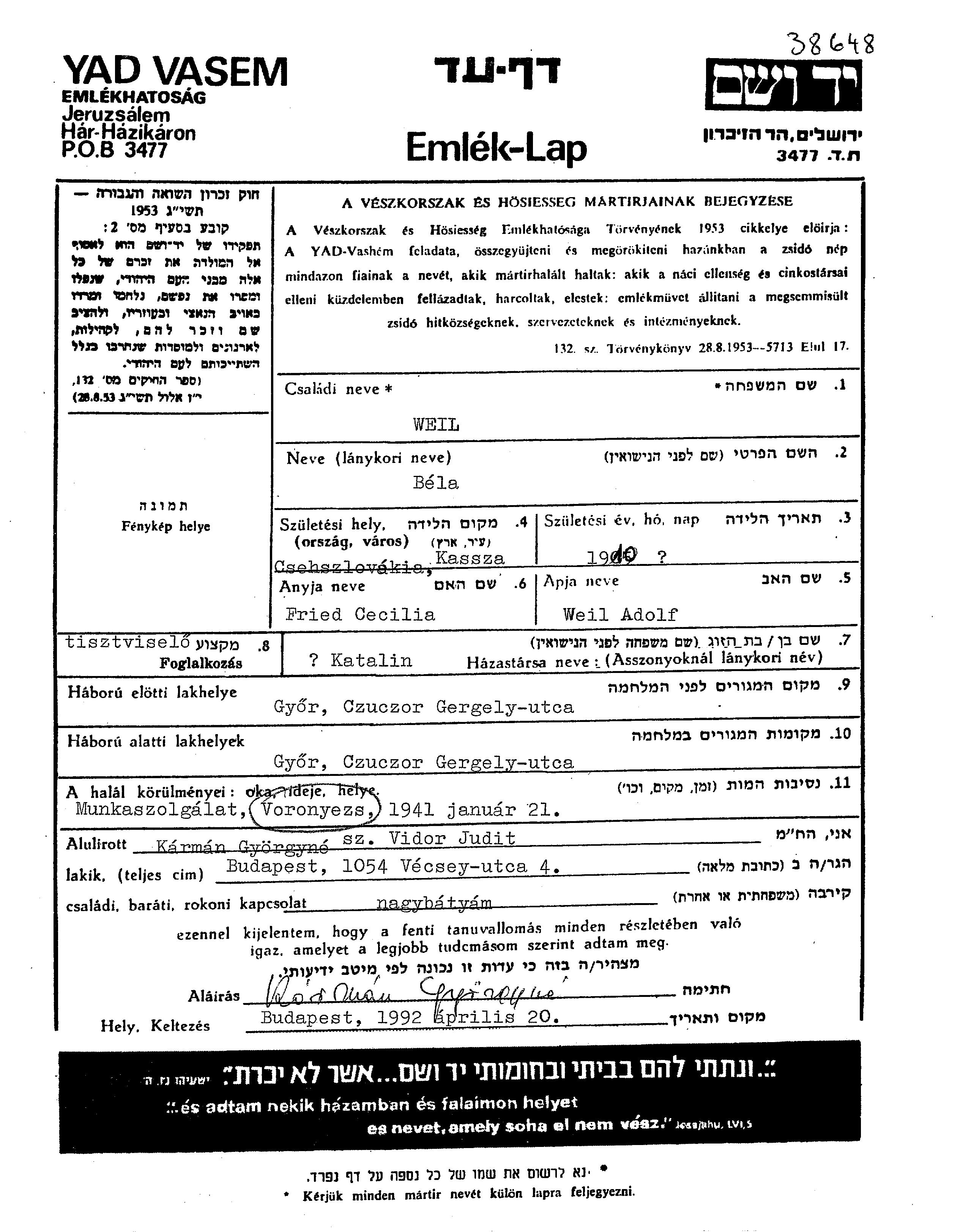 Weil Bela 1910 Gyor, Hongrie Feuille de témoignage