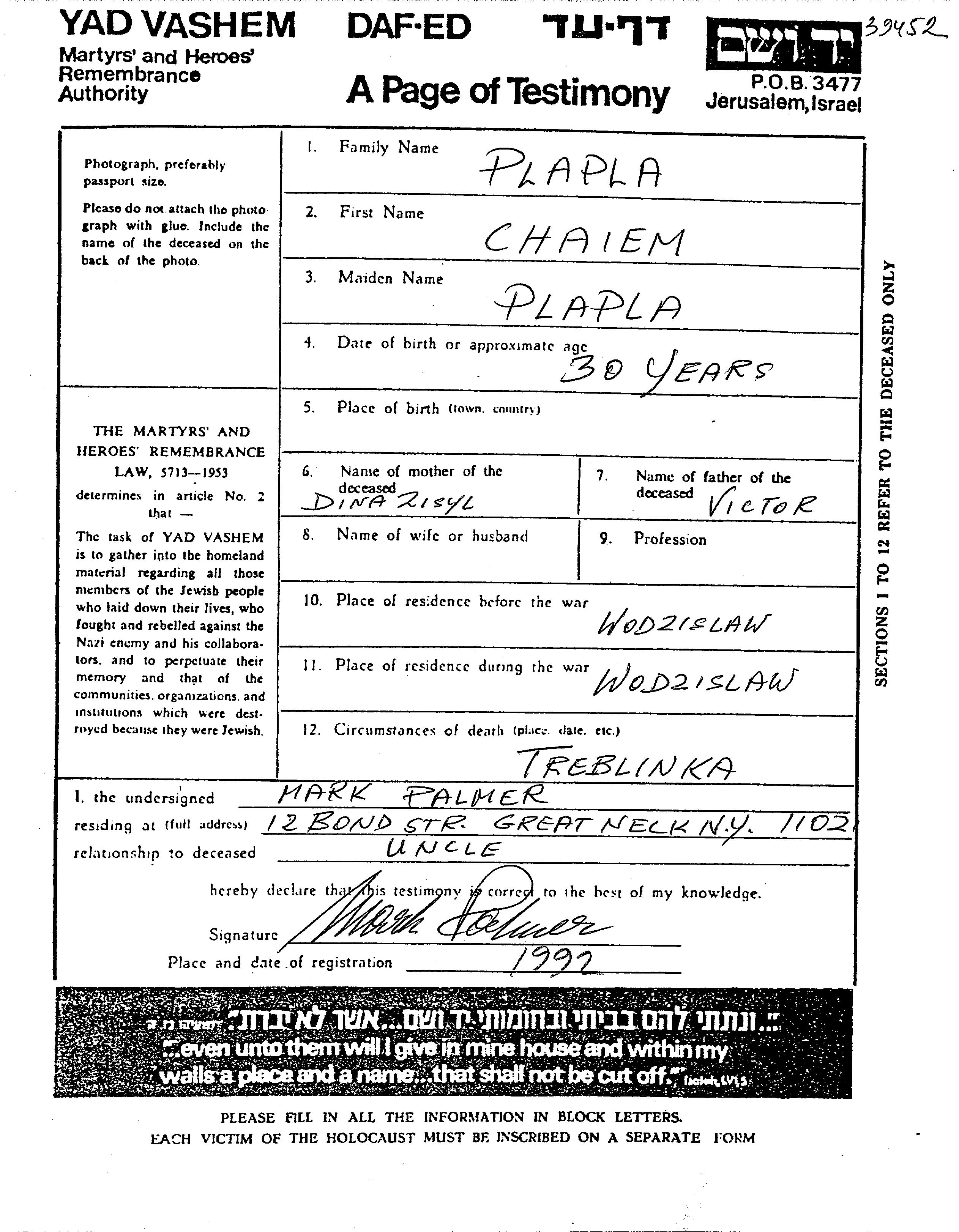 Yad Vashem - Pages of Testimony Names Memorial Collection