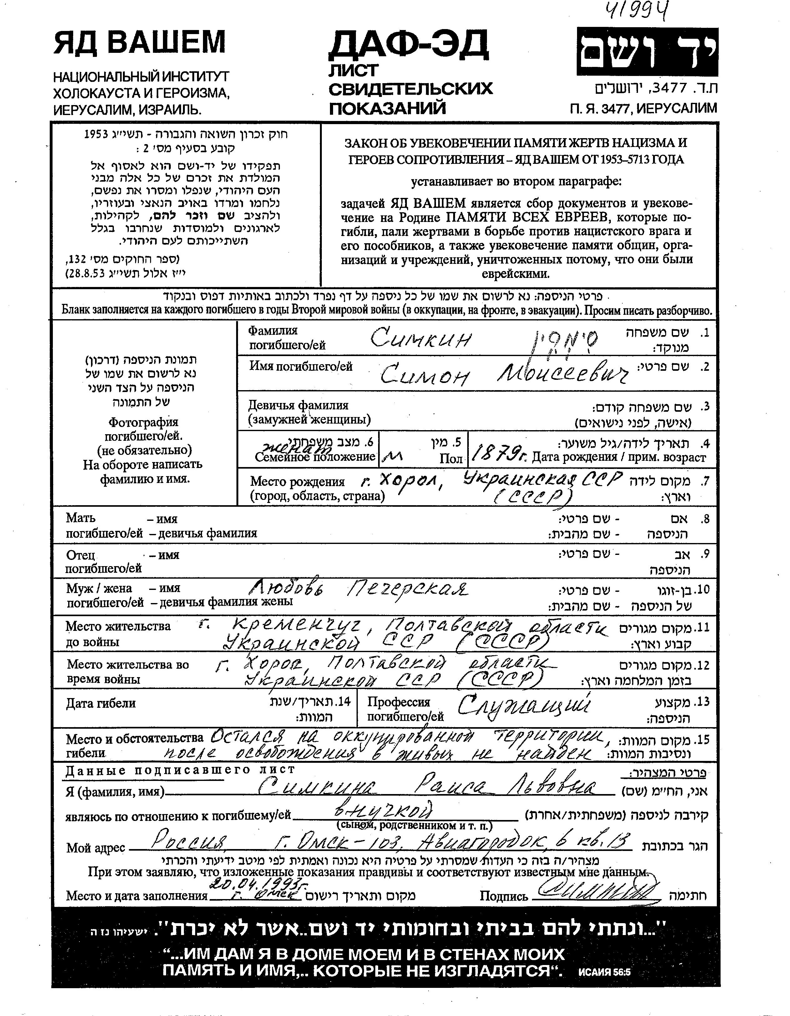 Simkin Simon 1879 Kremenchug, Ukraine (URSS) Feuille de témoignage