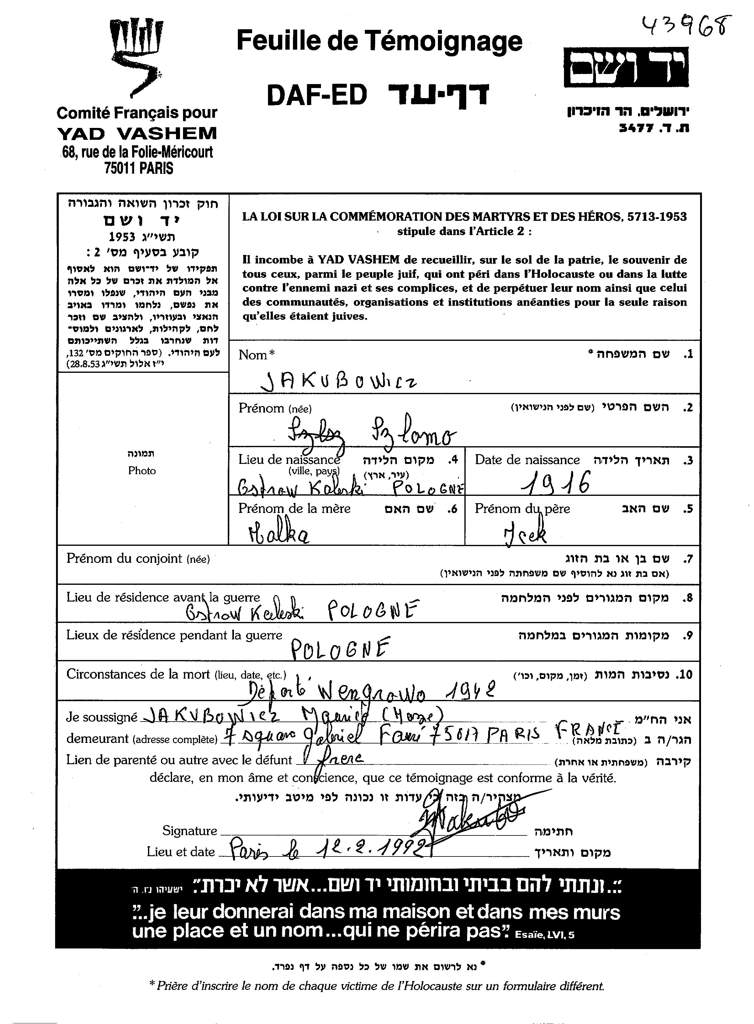 Recherche par nom du dépositeur de la Feuille de témoignage. Cette recherché indique aussi les noms de jeunes filles.
