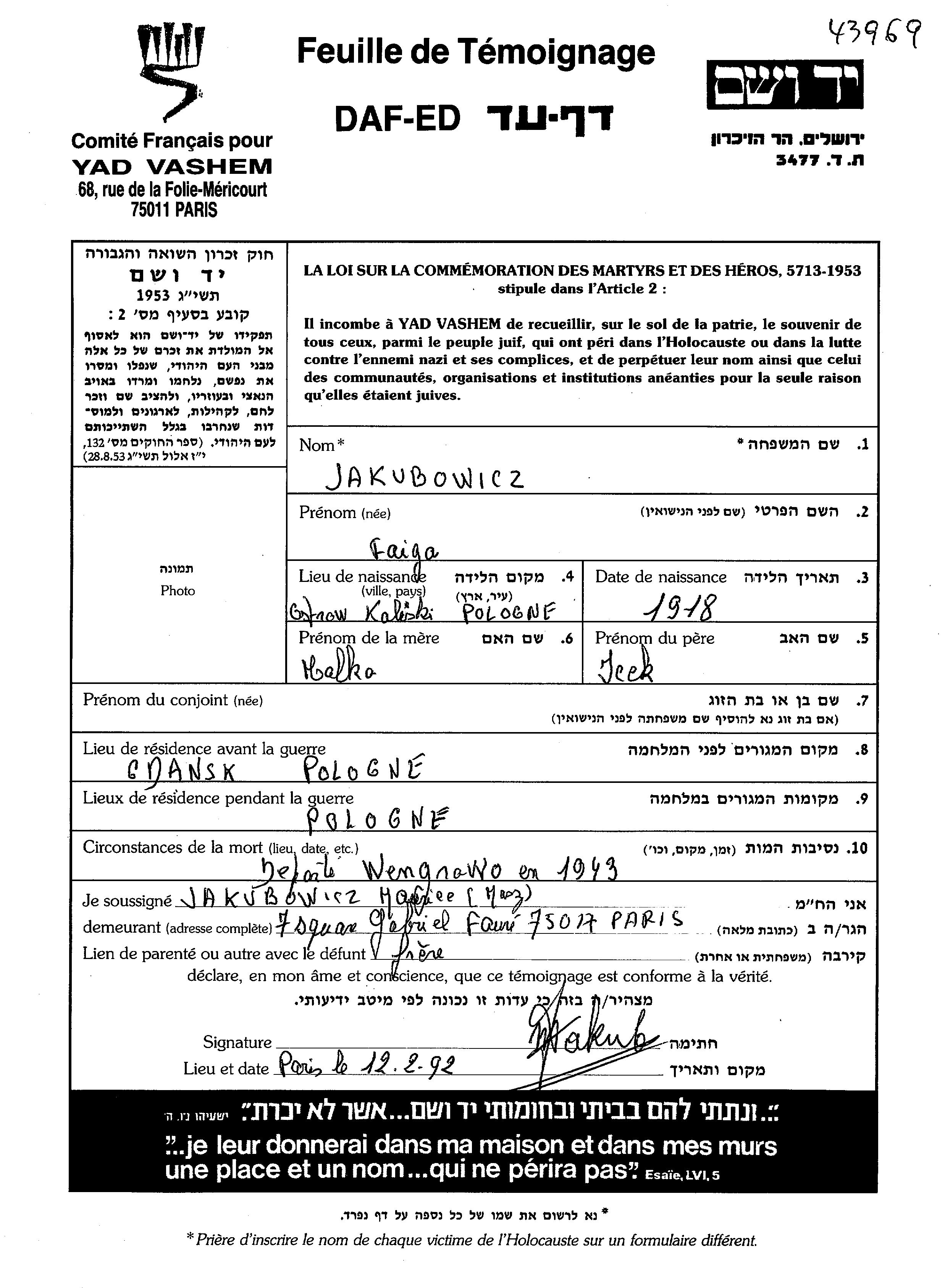 Faiga Jakubowicz est née à Ostrow Kaliski, Pologne en 1918, fille de Icek et de Malka. Avant la seconde guerre mondiale elle vivait à Gdansk, Ville Franche de Danzig. Pendant la guerre, elle était à Pologne.