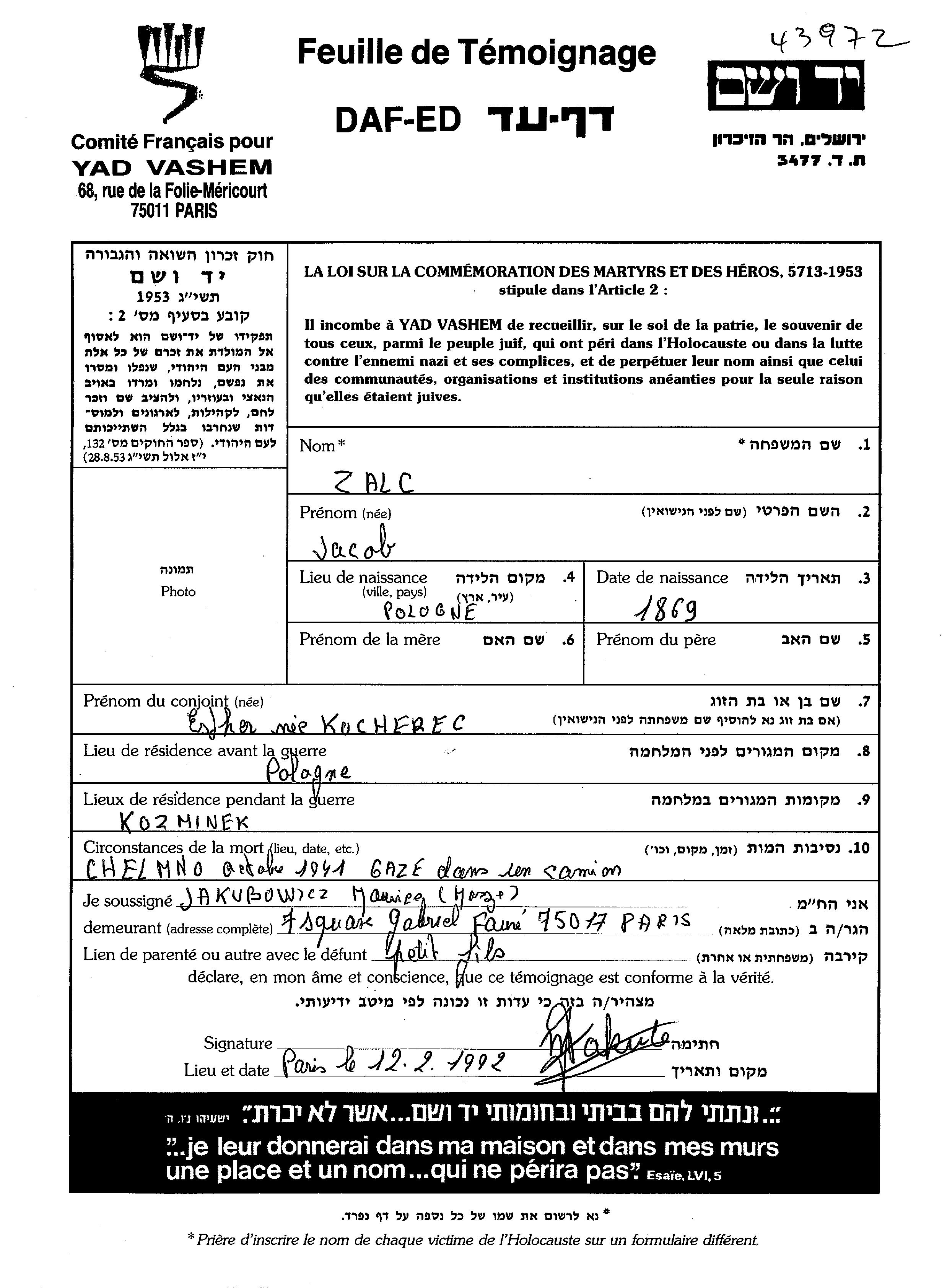 Zalc Jacob 1869 Pologne Feuille de témoignage
