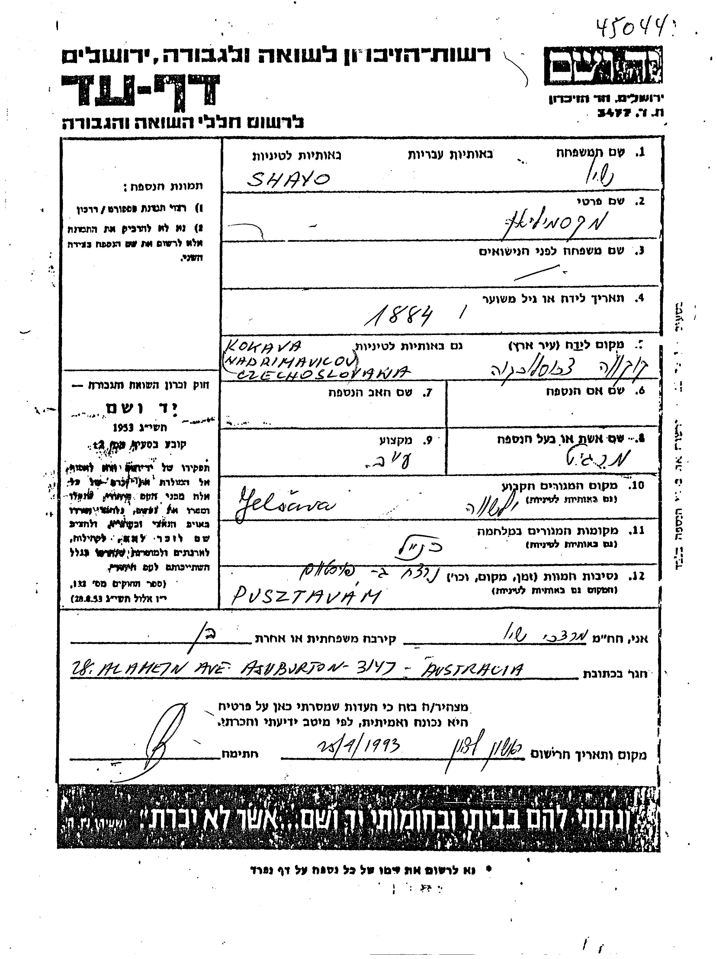 Shayo Maximilian 1884 Jelsava, Tchécoslovaquie Feuille de témoignage