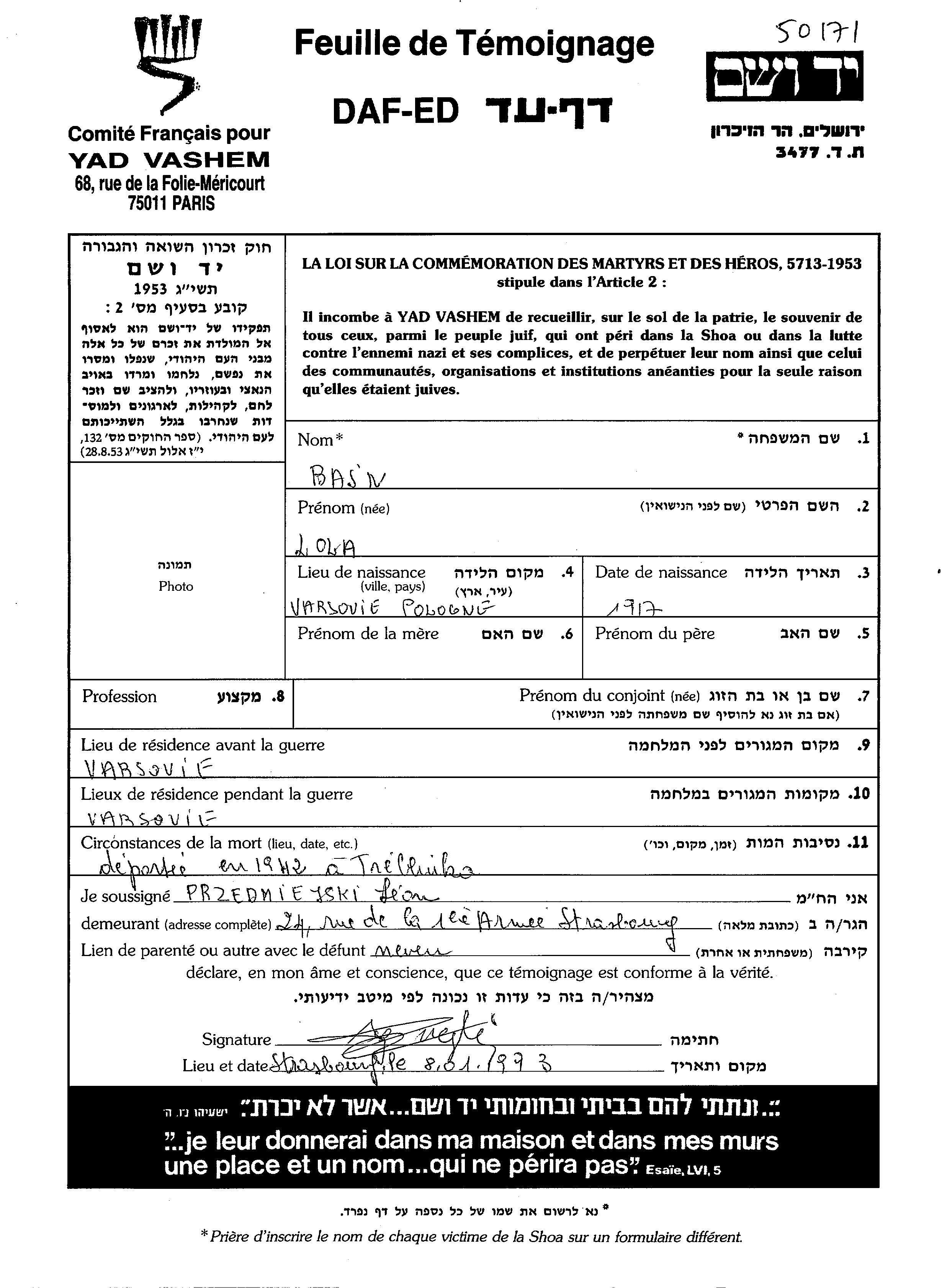 Bajn Lola 1917 Warszawa, Pologne Feuille de témoignage