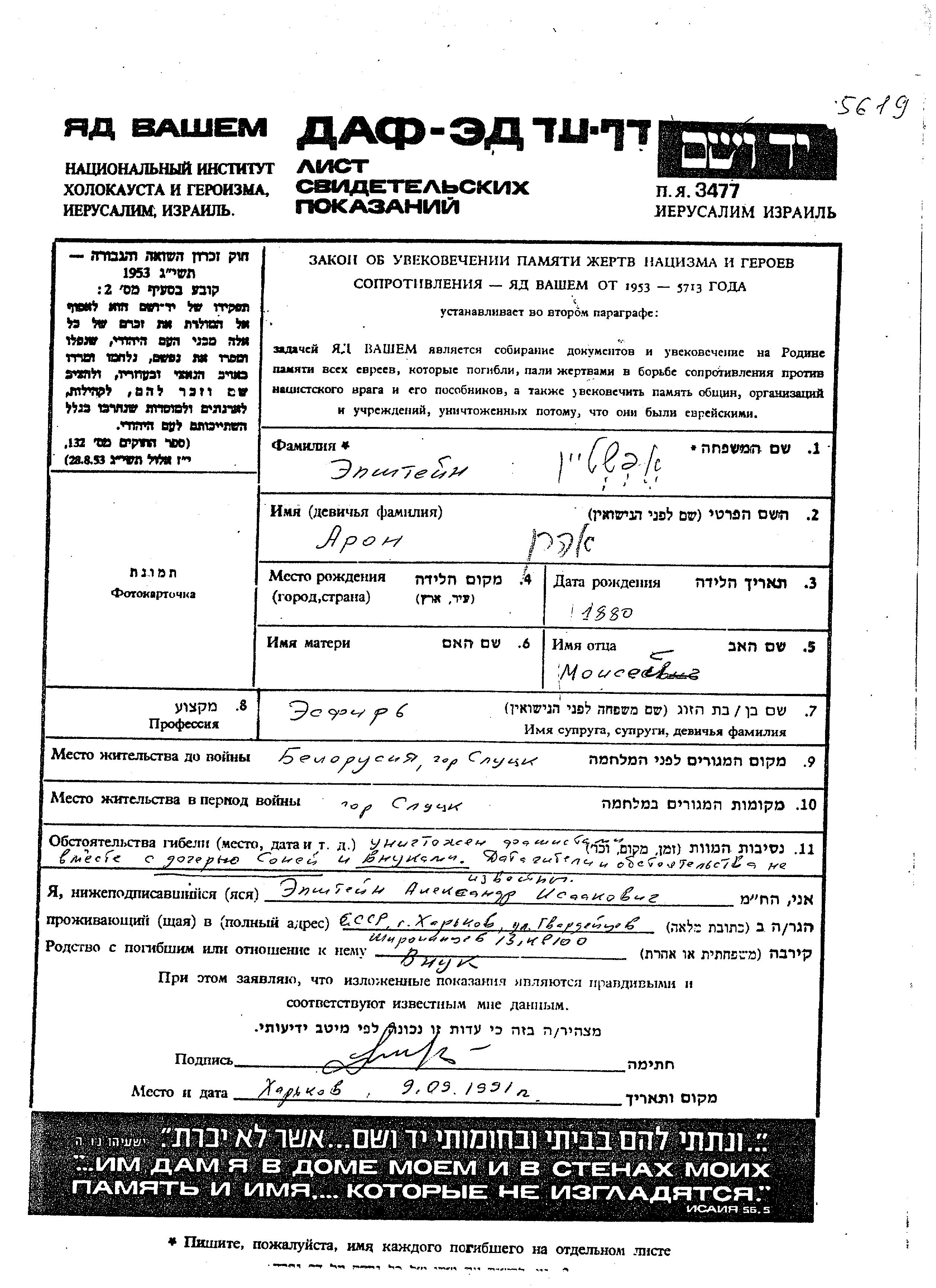 nom inconnu Sonia Slutsk, Bélorussie (URSS) Feuille de témoignage