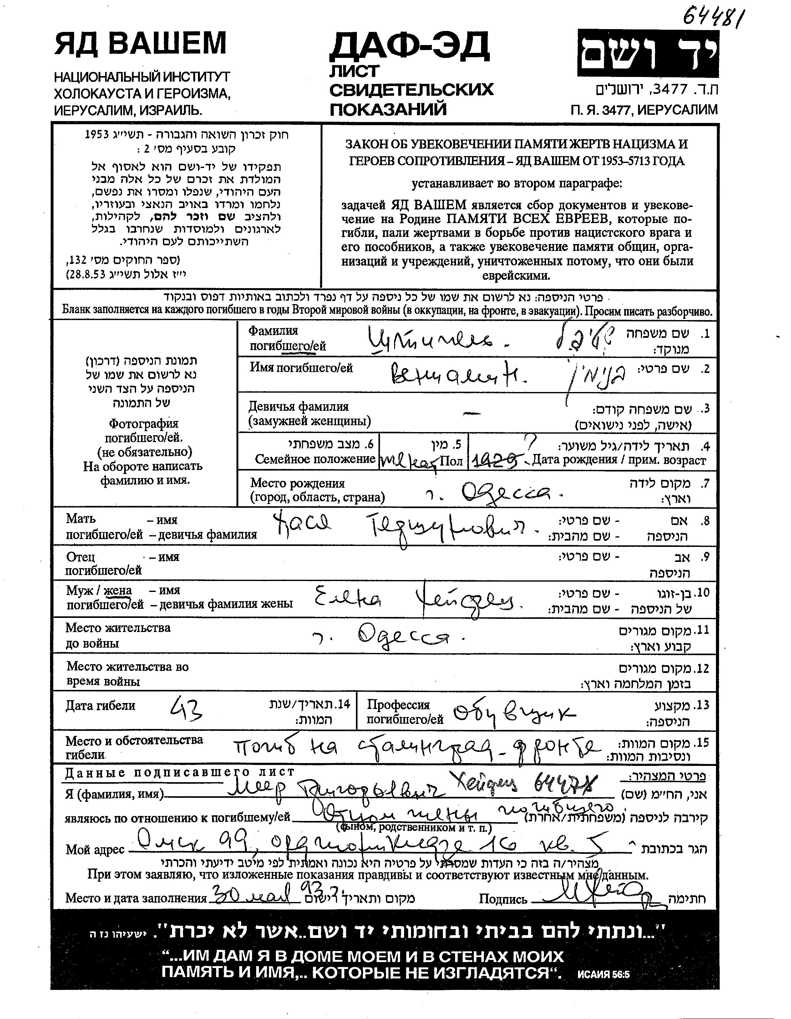 Venyamin Shtipel est né à Odessa, Ukraine (URSS), fils de Khasia née Gershunovich. Il était Cordonnier et Mariée à Yelena. Avant la seconde guerre mondiale il vivait à Odessa, Ukraine (URSS). Au cours de la guerre, il était à the Soviet armed forces. Venyamin a été tué en tant que militaire pendant la Seconde Guerre mondiale. Lieu de la mort: Stalingrad, Russie (URSS) en 1943.