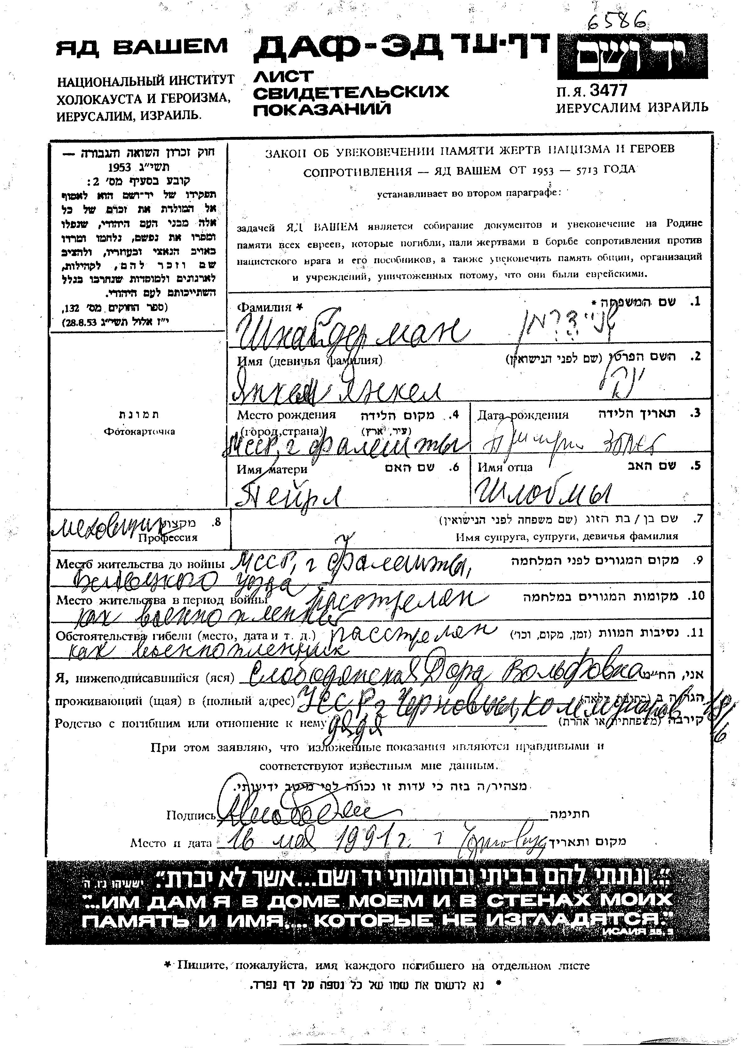 | Schnaiderman | Yankel | 1920 | Faleshti, Roumanie | Feuille de témoignage |