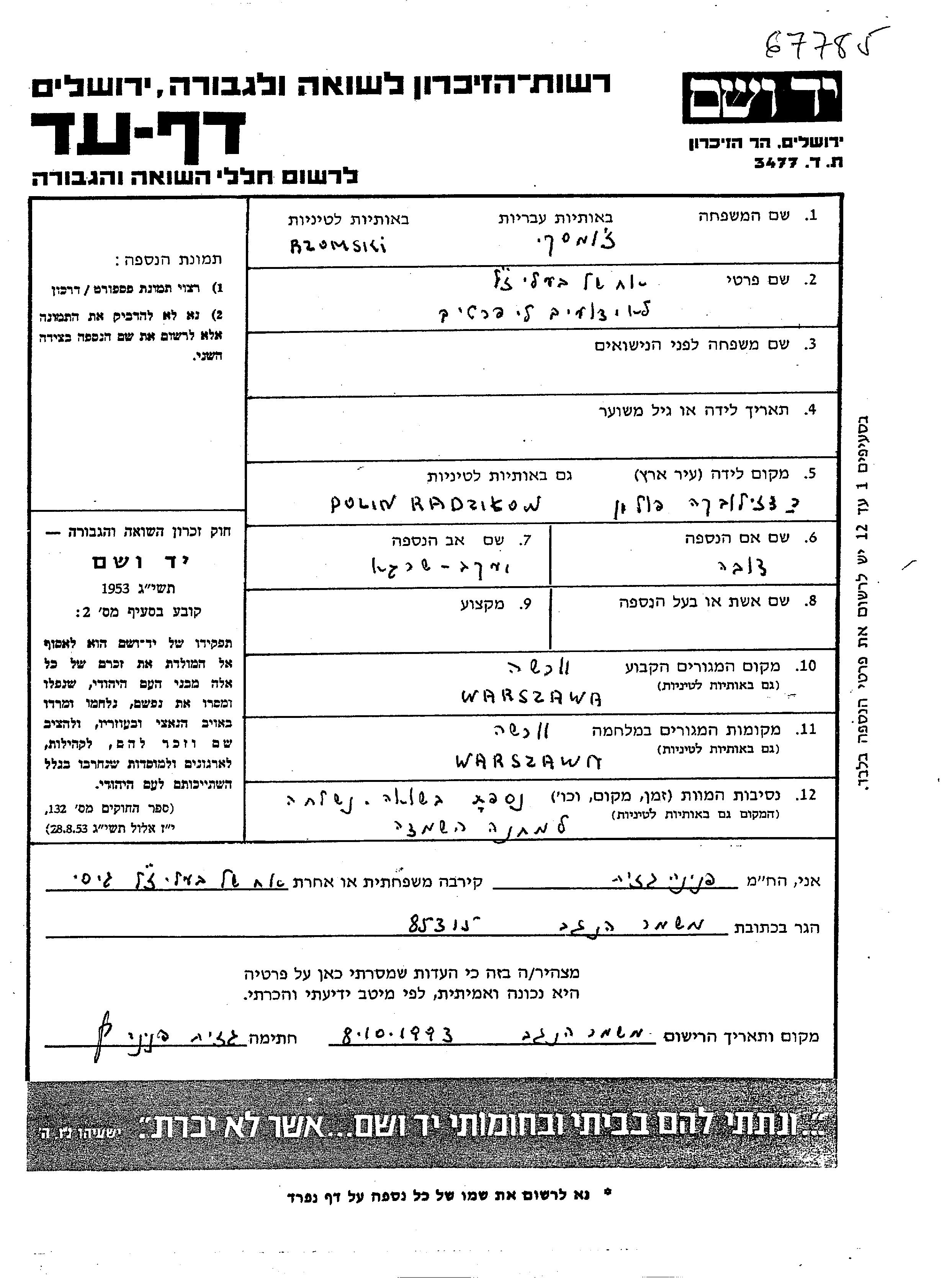 Rzomski prénom inconnu Warszawa, Pologne Feuille de témoignage