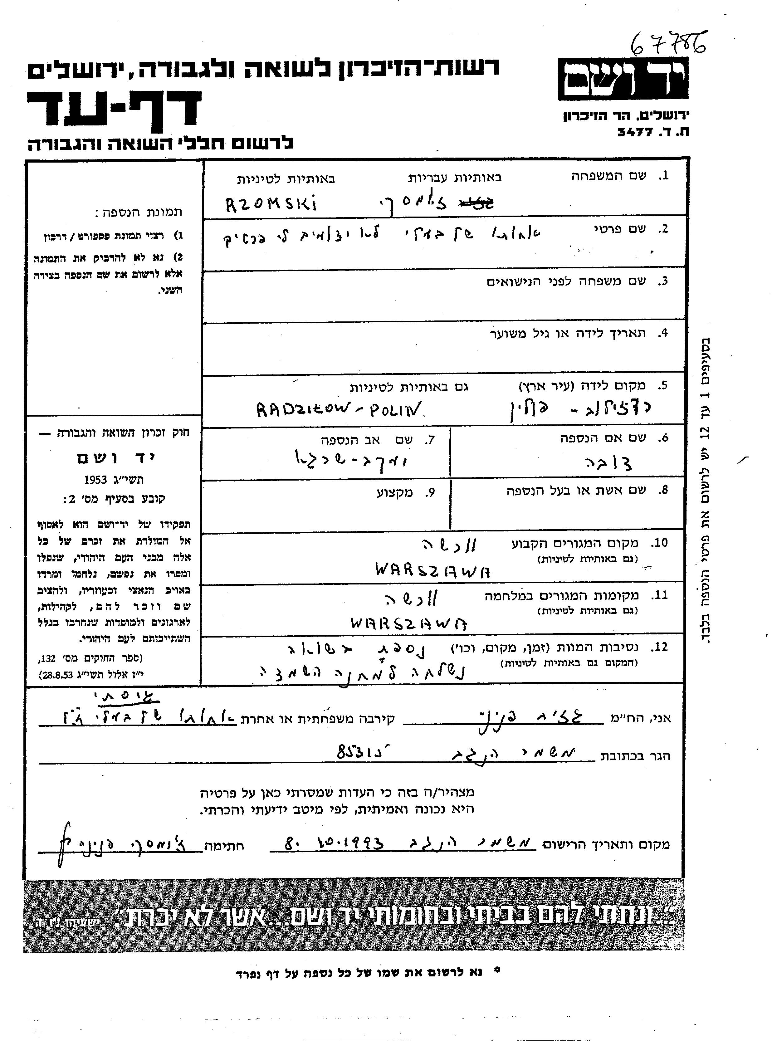 Rzomski prénom inconnu Warszawa, Pologne Feuille de témoignage