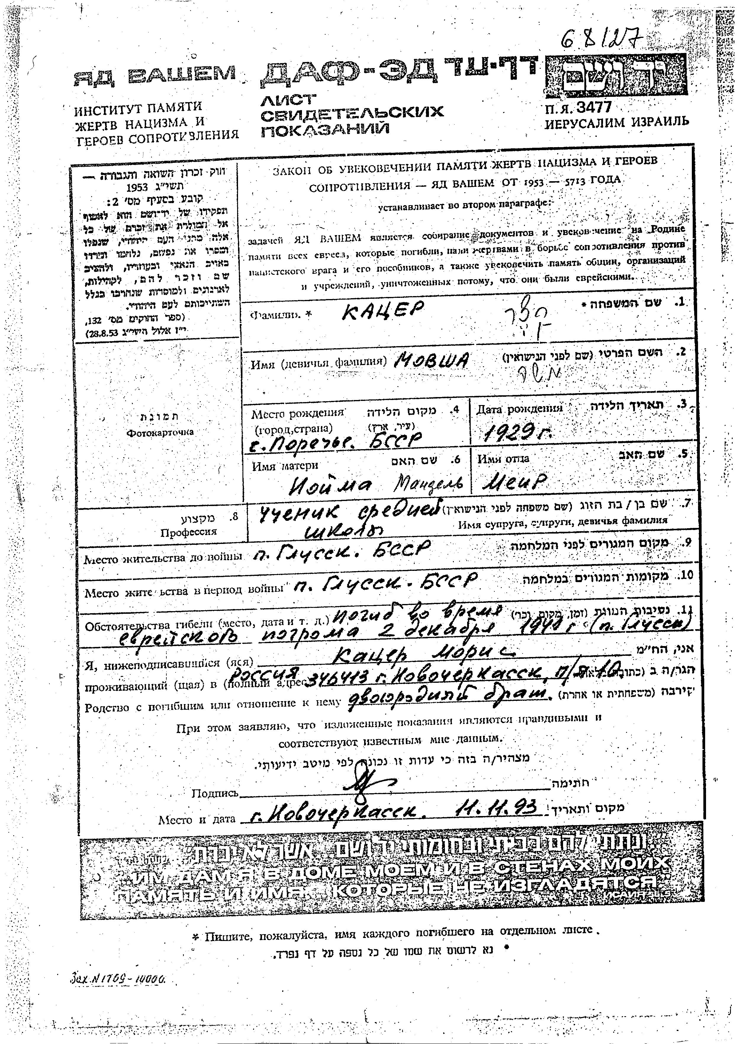 Katzer Movsha 1929 Glussk, Bélorussie (URSS) Feuille de témoignage