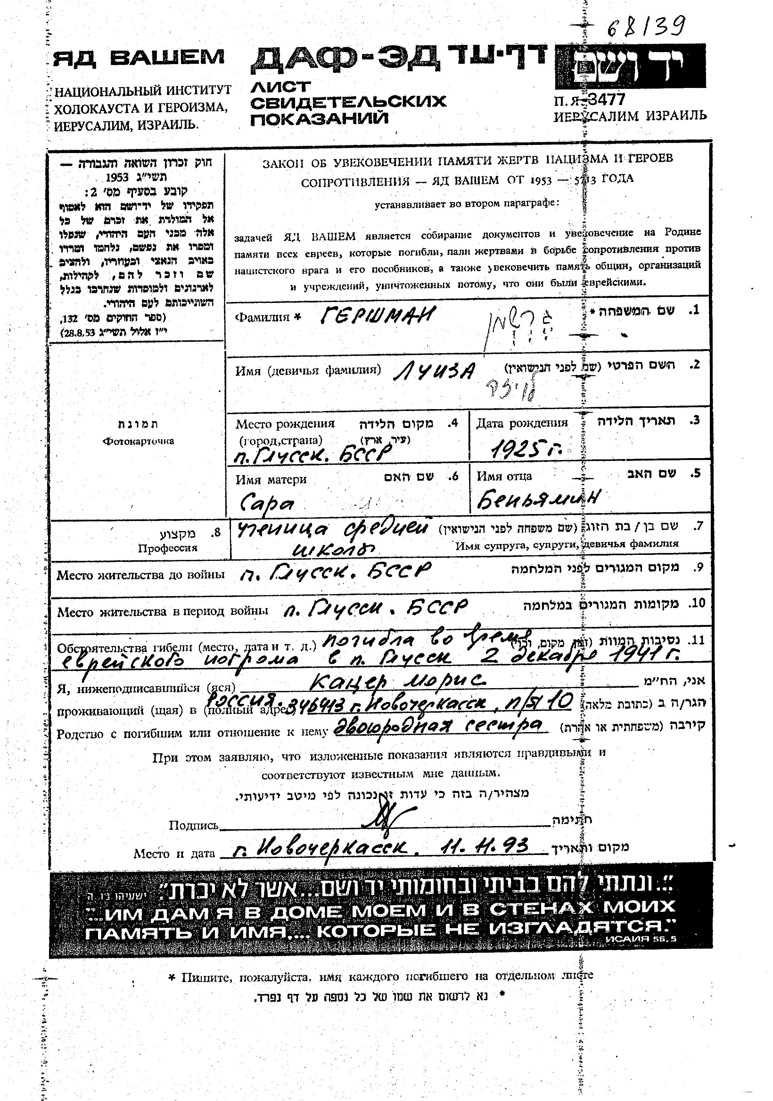 Gershman Luiza 1925 Glussk, Bélorussie (URSS) Feuille de témoignage