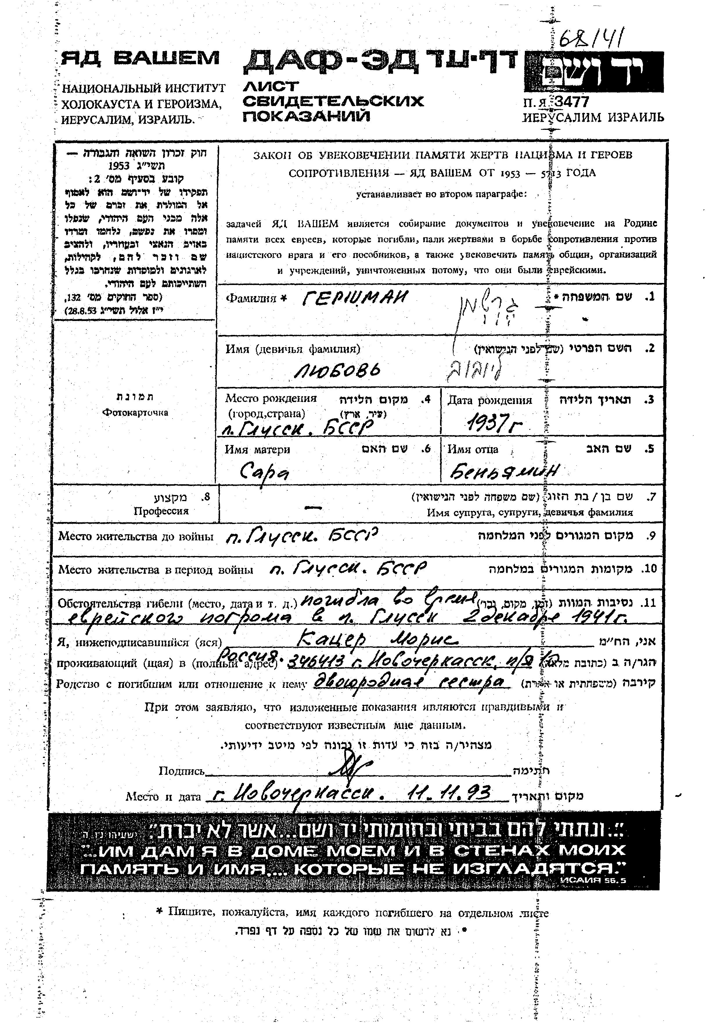 Gershman Liubov 1937 Glussk, Bélorussie (URSS) Feuille de témoignage
