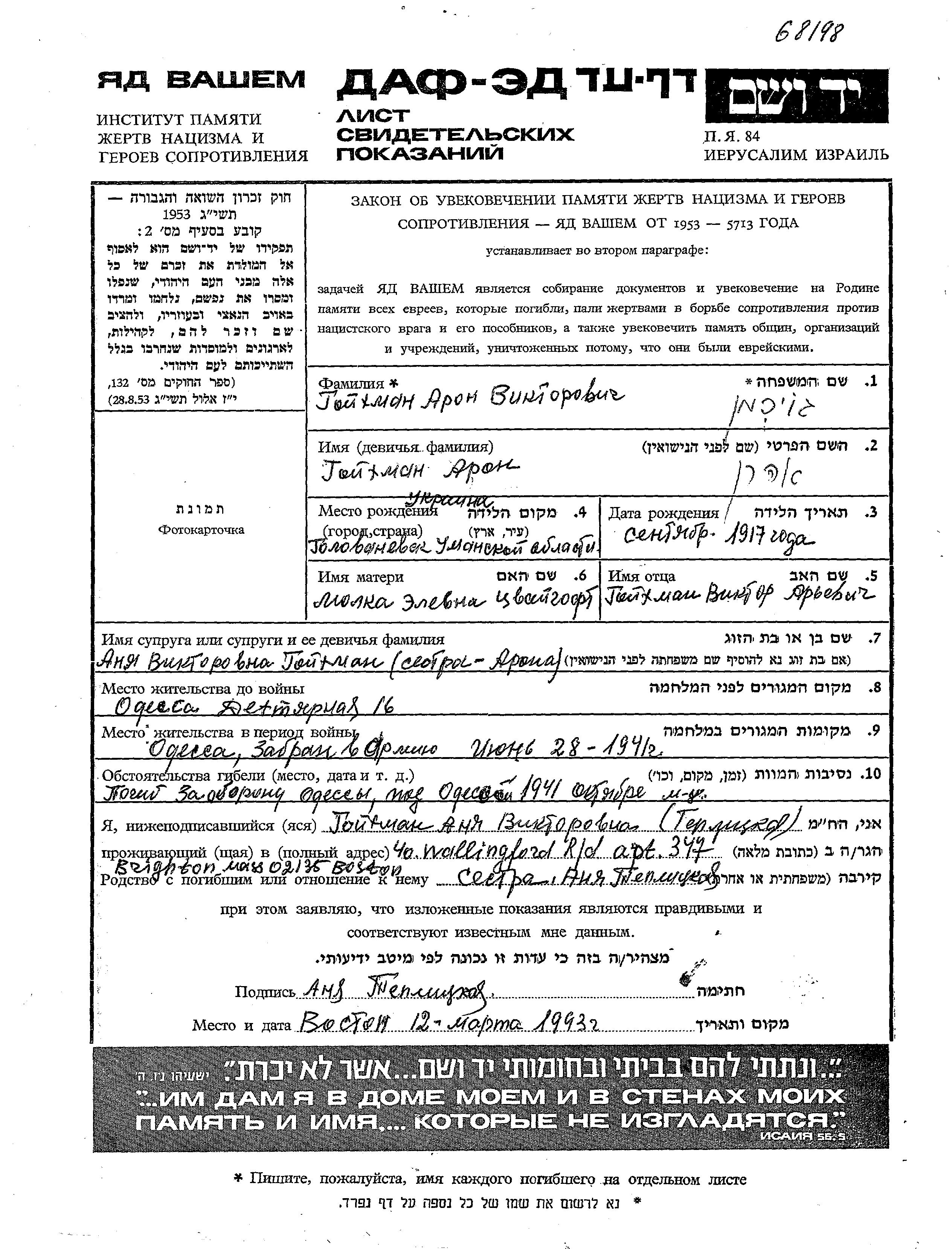 Goikhman Aron 1917 Odessa, Ukraine (URSS) Feuille de témoignage