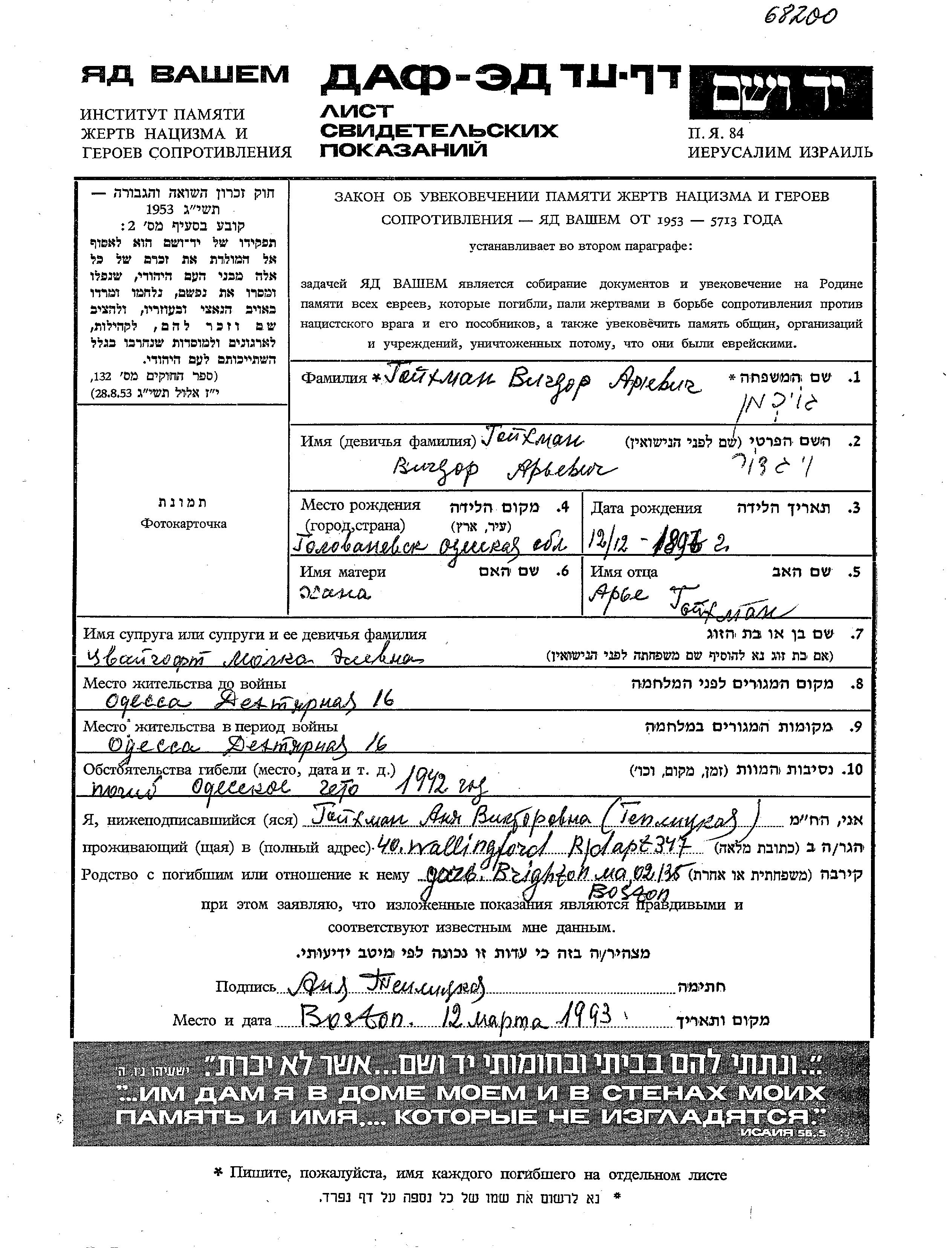 Goikhman Vigdor 1896 Odessa, Ukraine (URSS) Feuille de témoignage