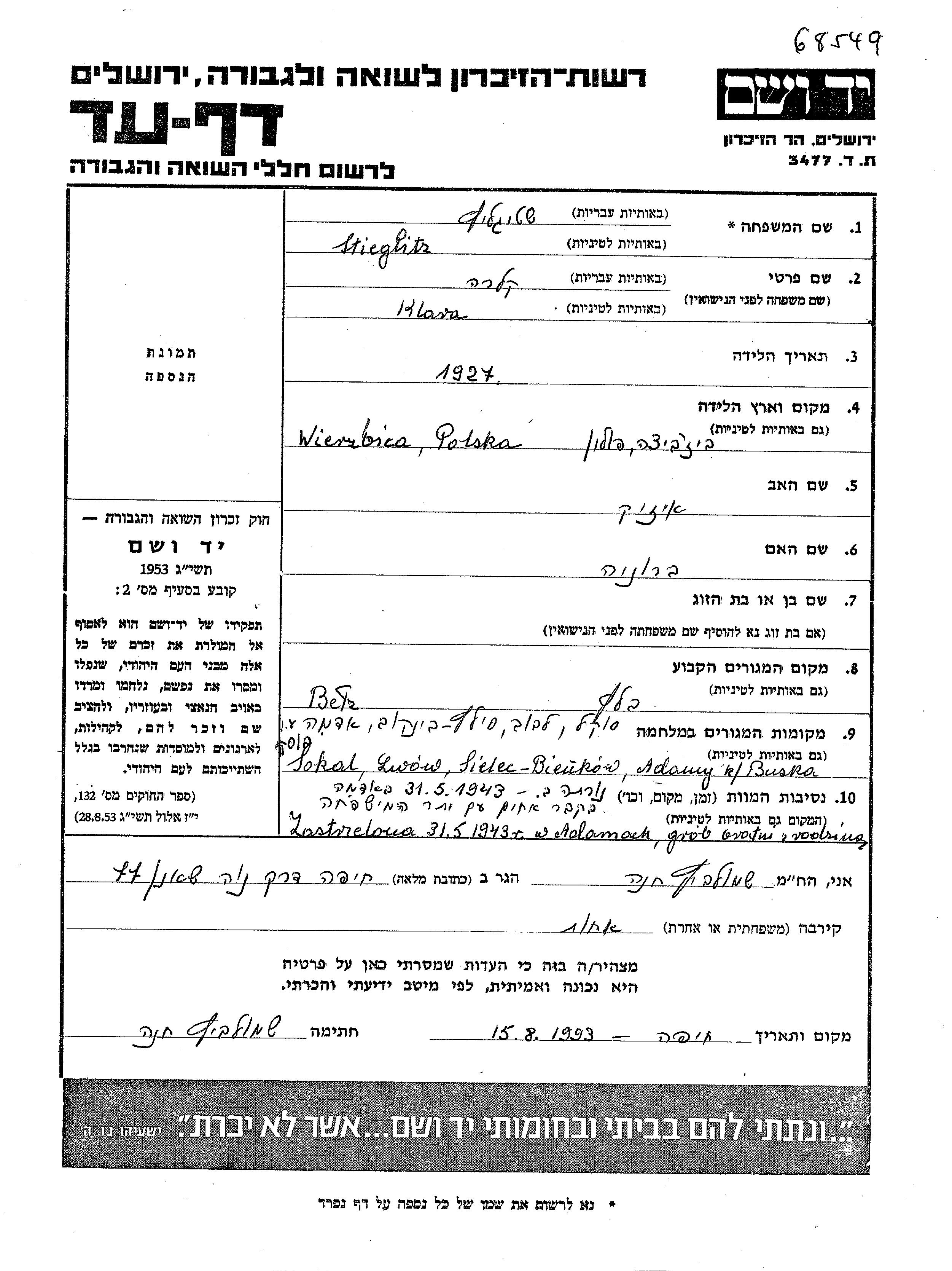 Stieglitz Klara 1927 Belz, Pologne Feuille de témoignage