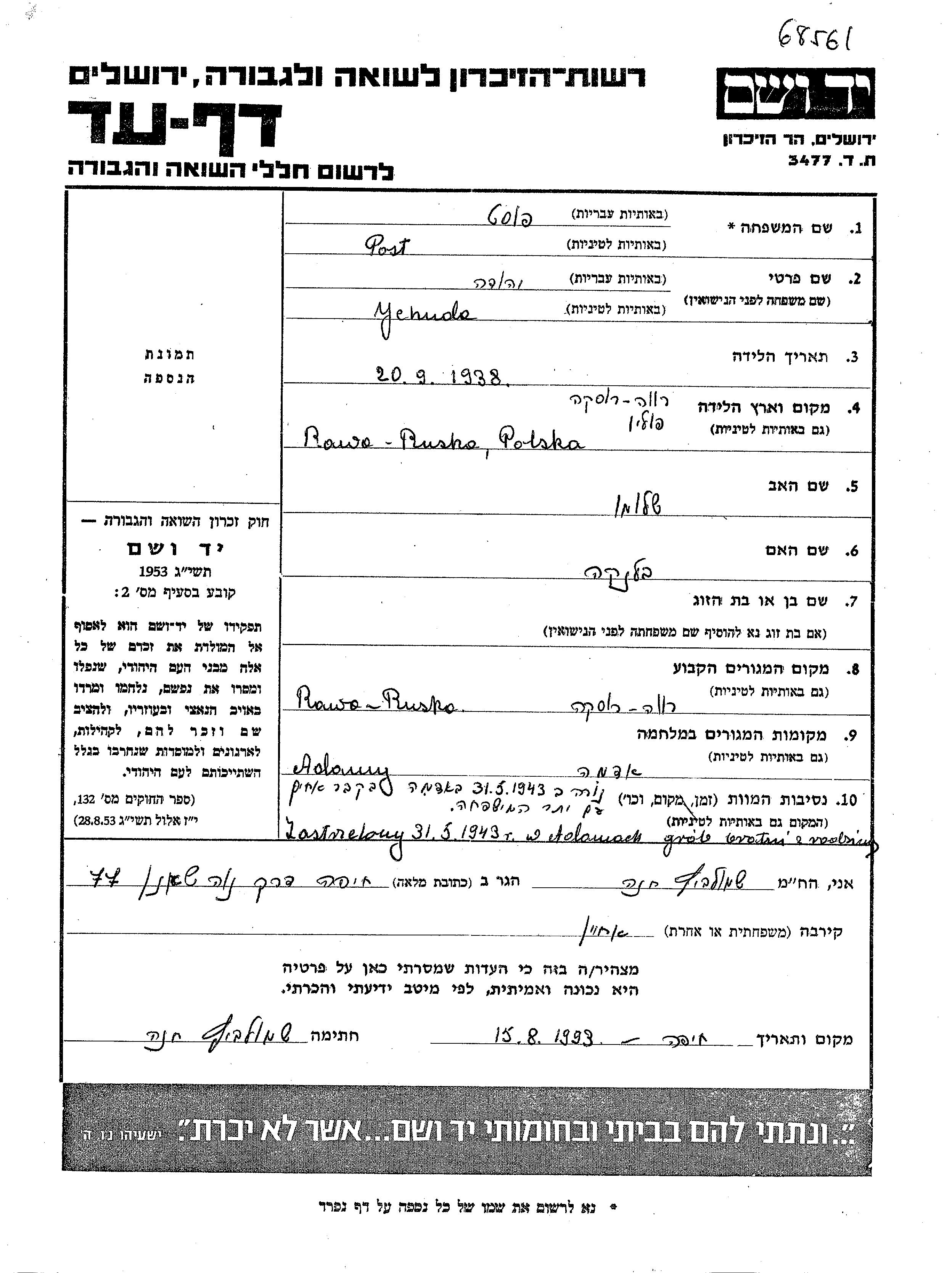Yehuda Post est né à Rawa Ruska, Pologne en 1938, fils de Shlomo et de Blanka née Stieglitz. Il était Enfant. Avant la seconde guerre mondiale il vivait à Rawa Ruska, Pologne. Au cours de la guerre, il était à Adamy, Pologne.