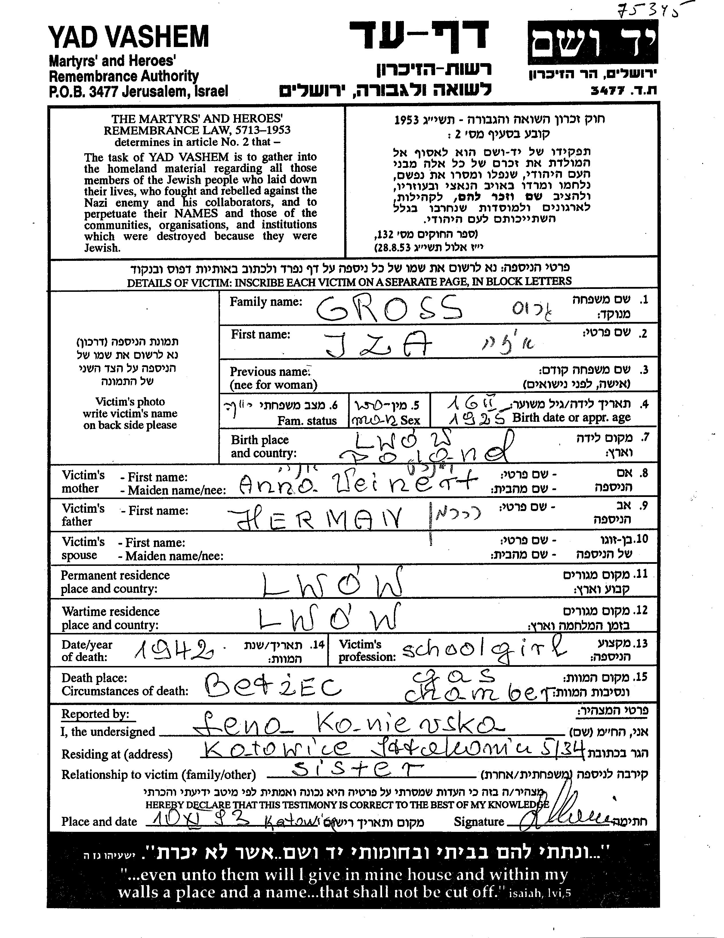 Gross Iza 1925 Lwow, Pologne Feuille de témoignage
