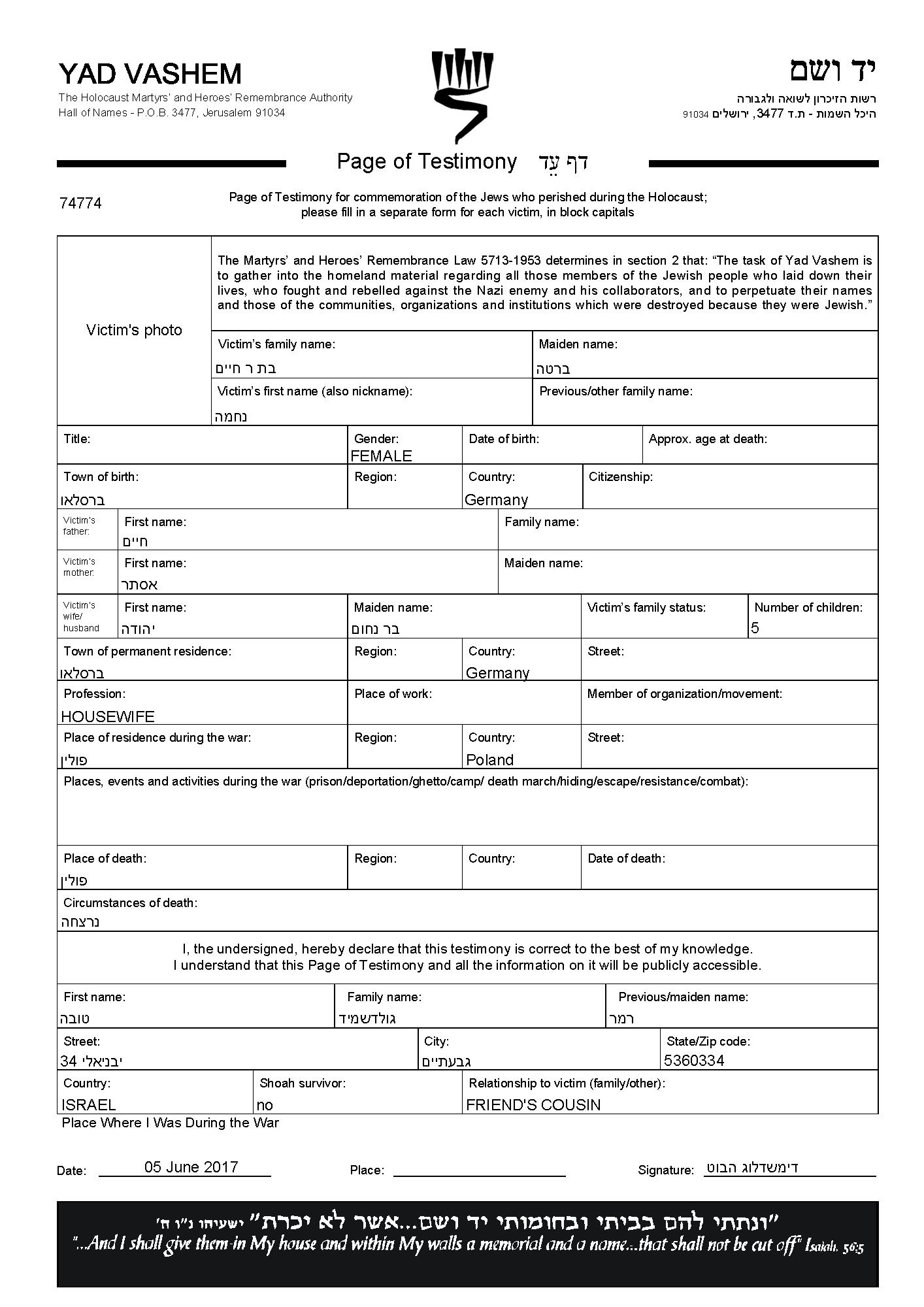 Yad Vashem - Pages of Testimony Names Memorial Collection