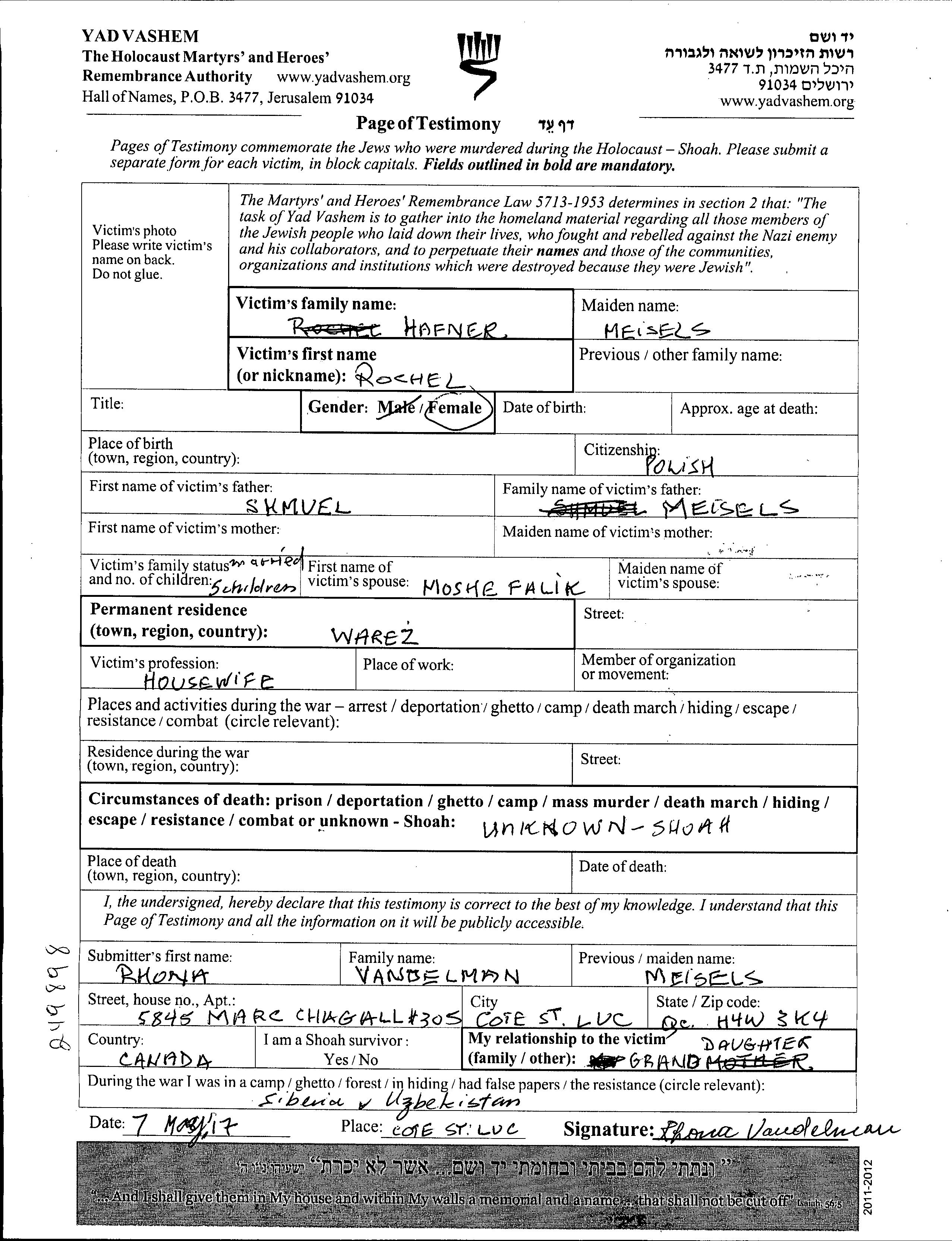 Rochel Hafner née Meisels est née fille de Shmuel. Elle était Femme au foyer et Mariée à Moshe Falik. Avant la seconde guerre mondiale elle vivait à Warez, Pologne.
