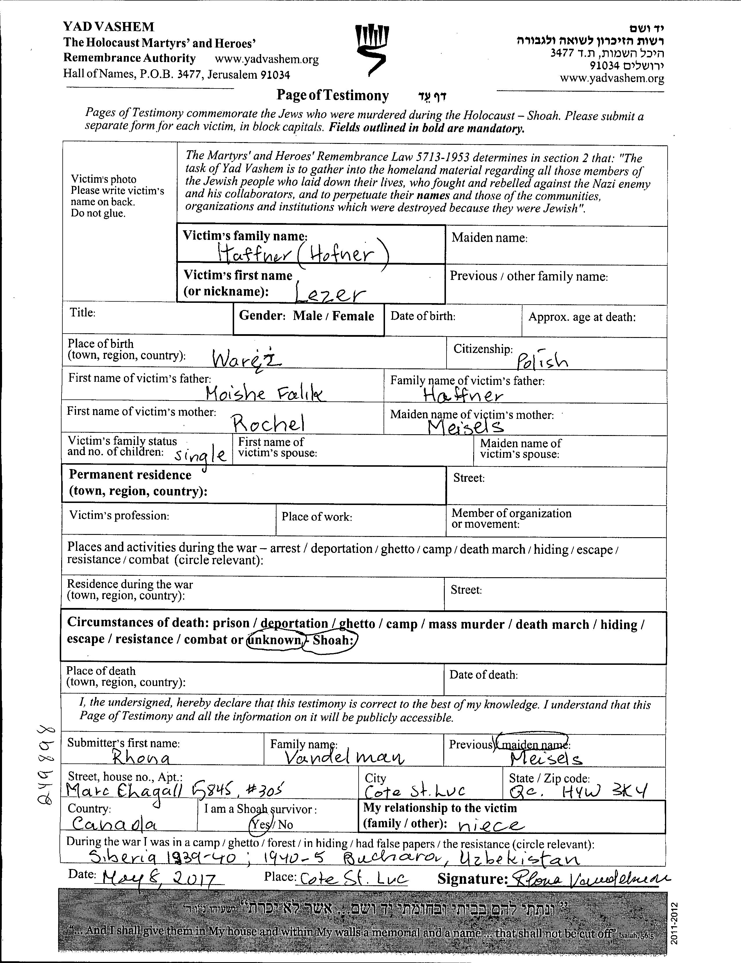 Hafner Hofner Lezer endroit inconnu, Feuille de témoignage