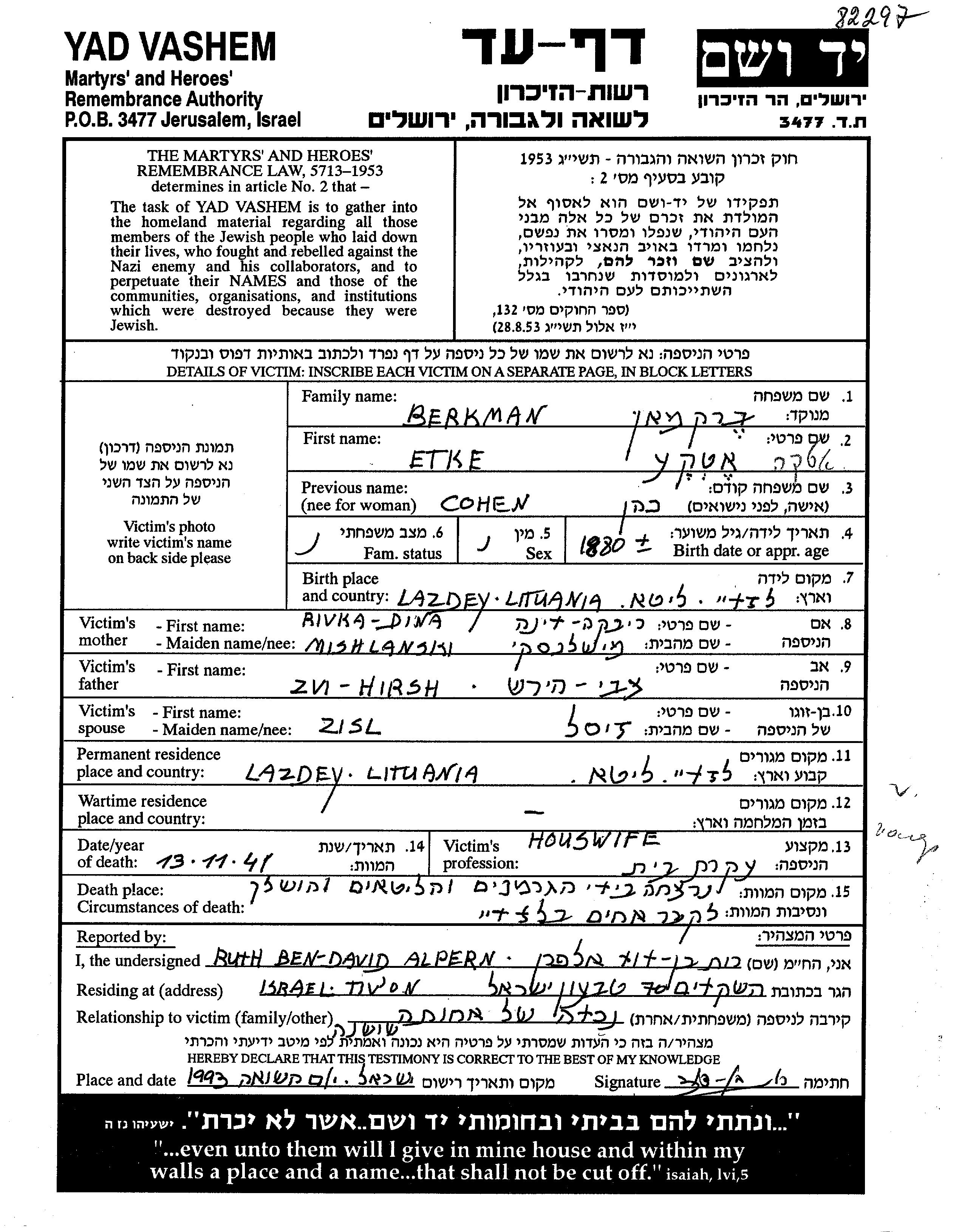 Etke Berkman née Cohen est née à Lazdei, Lituanie en 1880, fille de Zvi Hirsh et de Rivka Dina née Mishlanski. Elle était Femme au foyer et Mariée à Zisl. Avant la seconde guerre mondiale elle vivait à Lazdei, Lituanie.