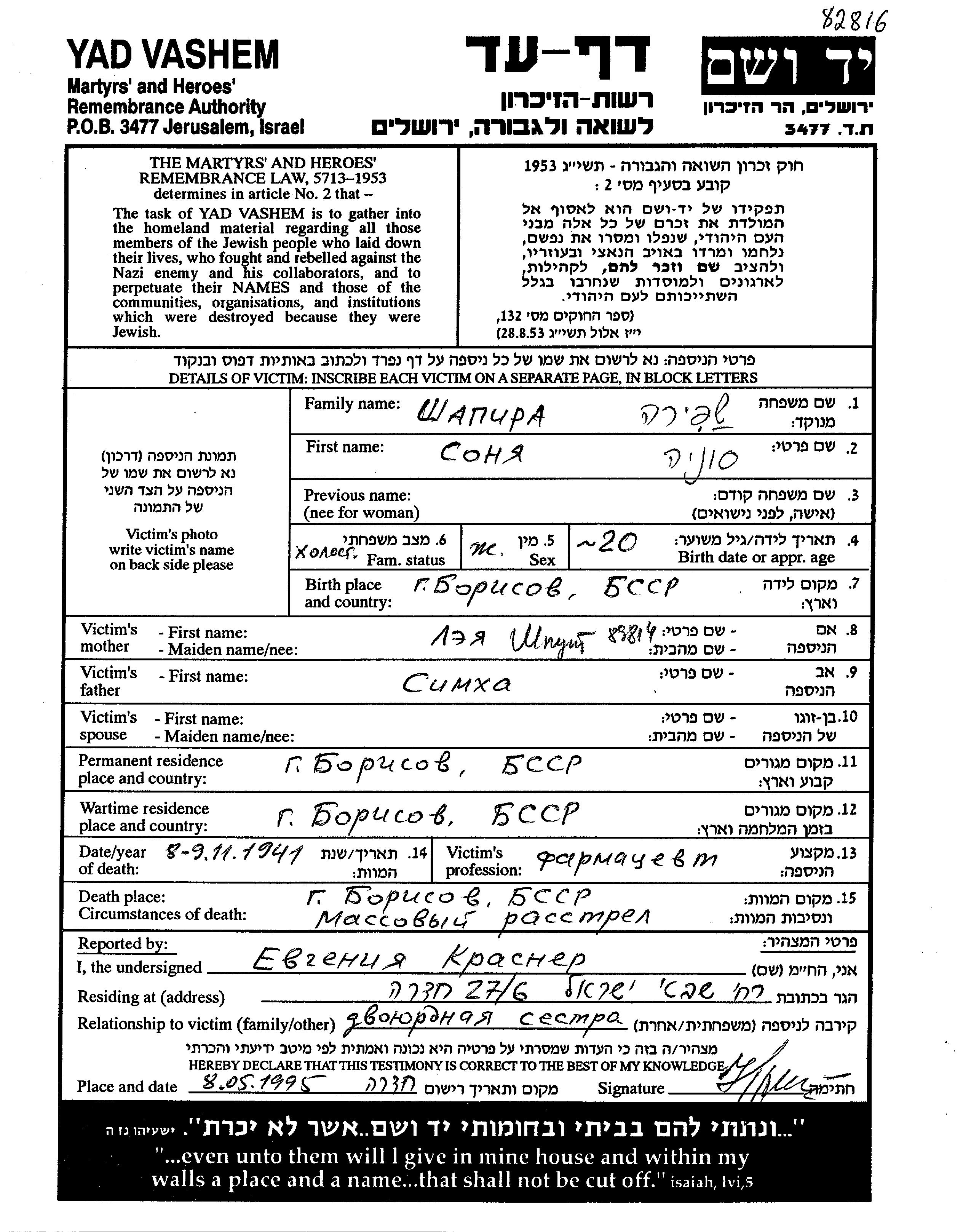 Shapira Sonia 1921 Borisov, Bélorussie (URSS) Feuille de témoignage