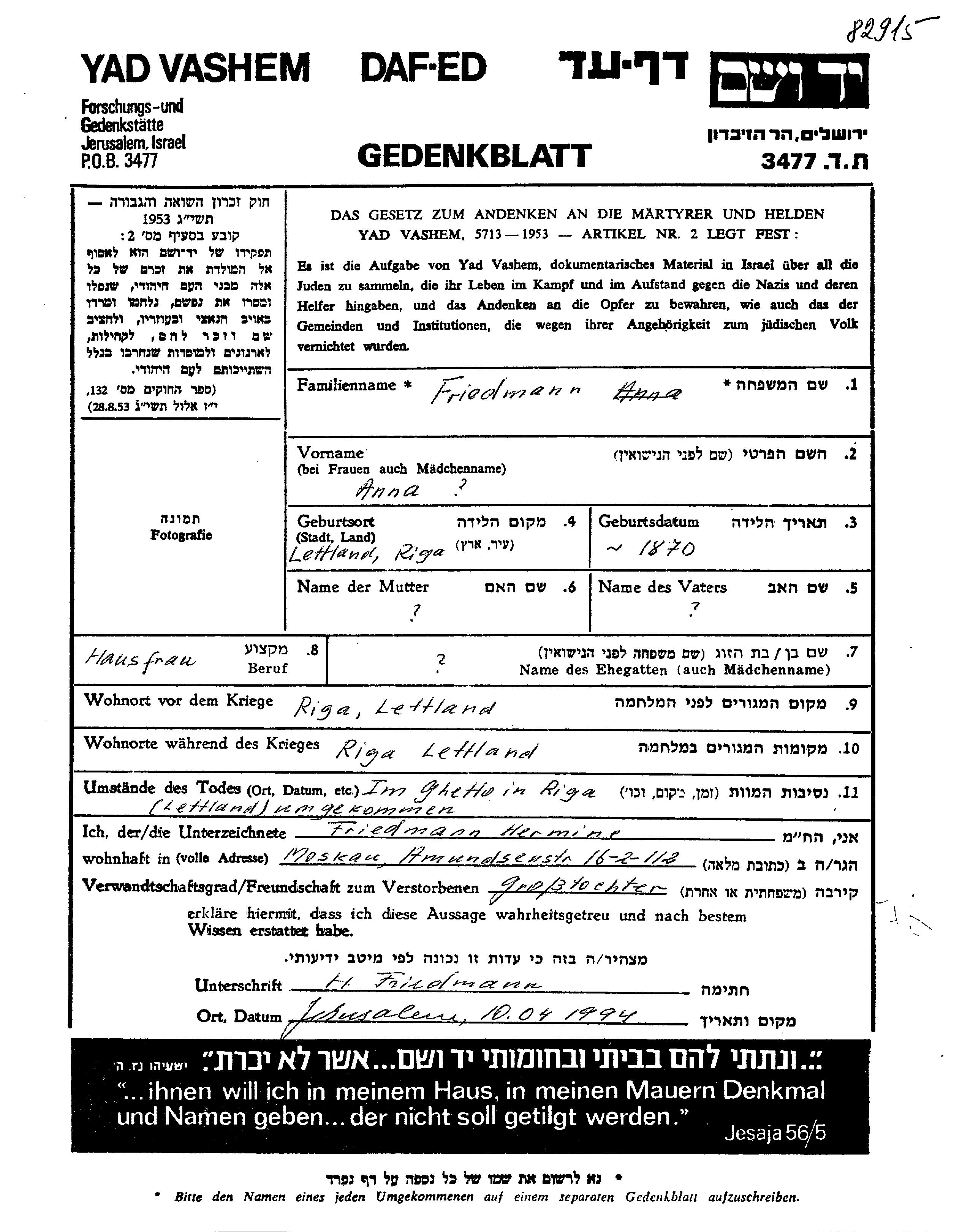 Friedmann Anna 1870 Riga, Lettonie Feuille de témoignage