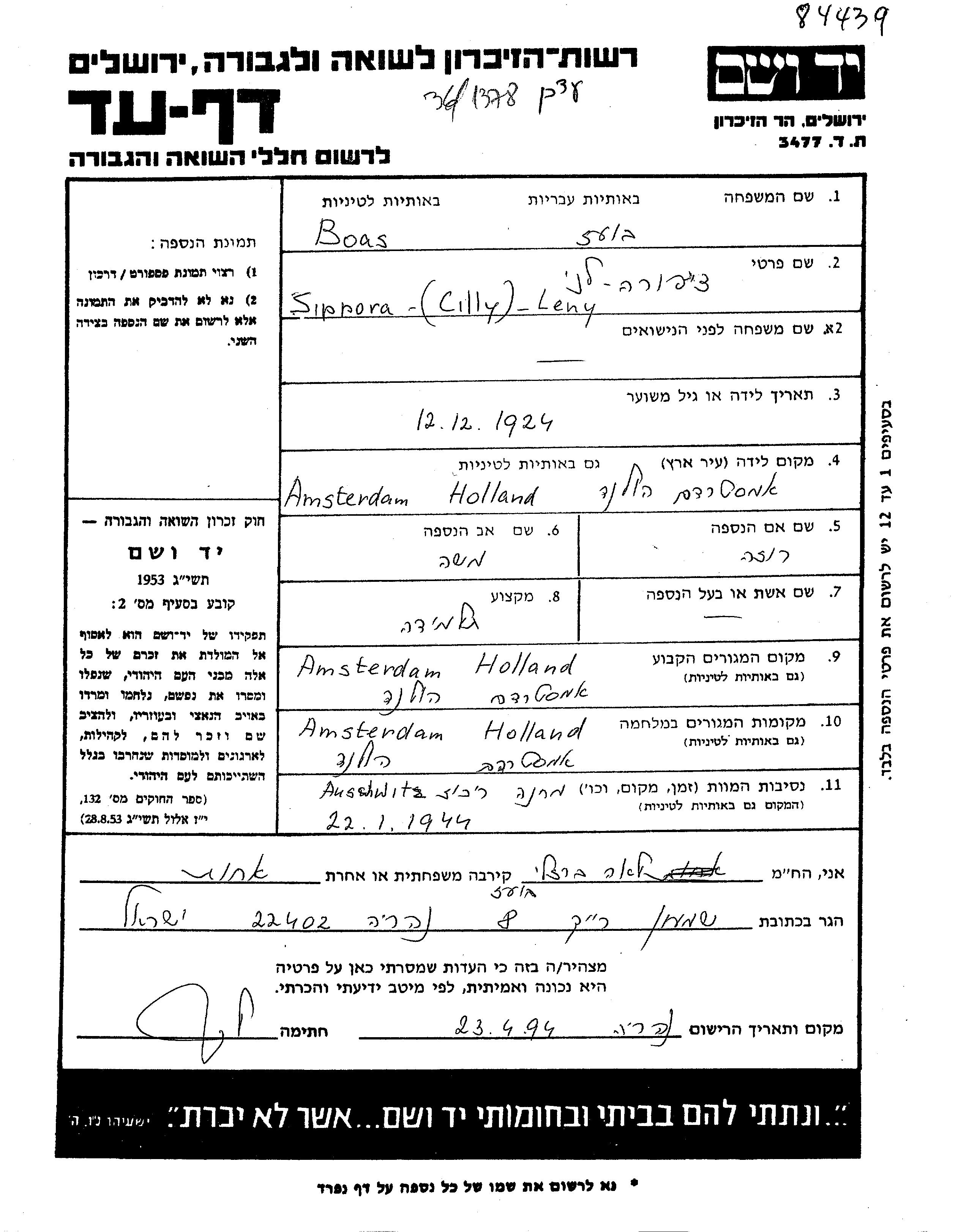 Boas Sippora Cilly Leny 1924 Amsterdam, Pays-Bas Feuille de témoignage